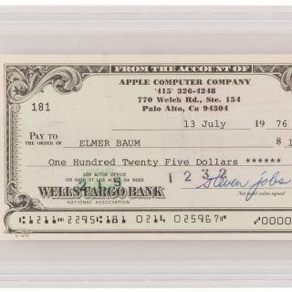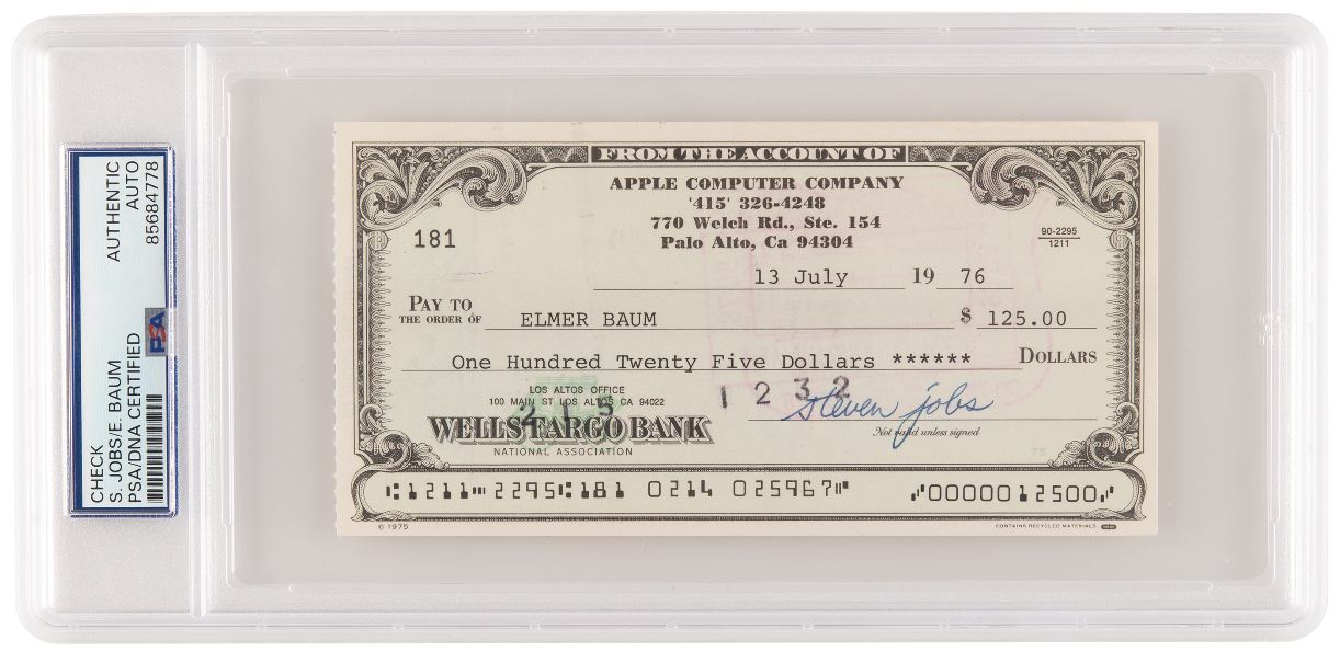 注目すべき品の1つに、RRオークションが「アップルコンピュータ社として初めて発行した小切手」と銘打った品がある。1976年3月16日付でジョブズとスティーブ・ウォズニアックが署名したウェルズ・ファーゴ銀行の500ドル小切手で、Apple-1のプリント基板を設計したハワード・カンティン宛てに振り出されたものだ。