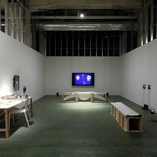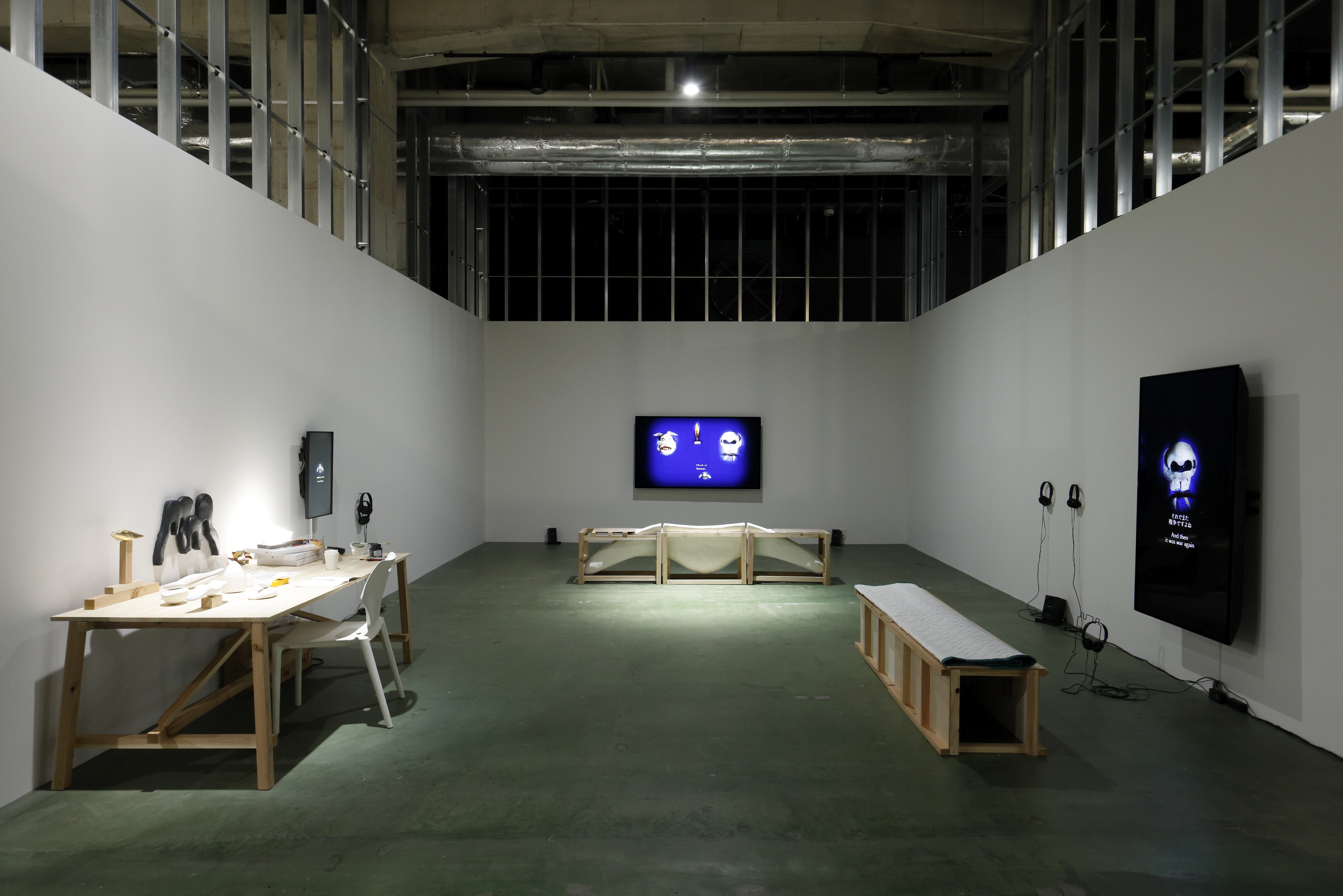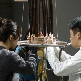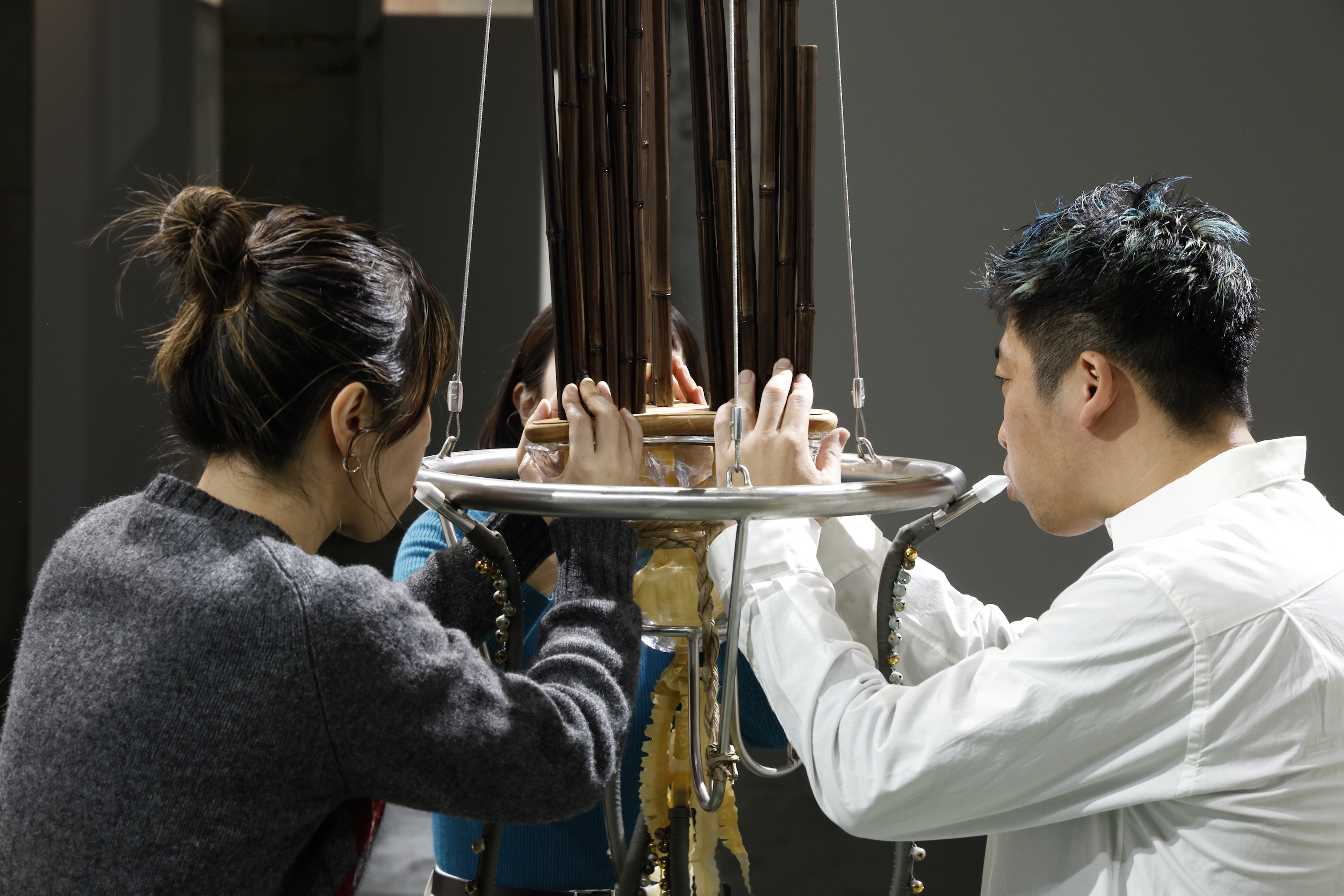 ドイツ・ベルリンを拠点に活動する谷中佑輔が手がける展示スペースの中央には、彫刻と楽器を兼ねる体験型作品が吊るされている。雅楽で使われる笙やタイのケーンといったアジアの伝統的なリード楽器からインスピレーションを得たという本作は、彫刻であると同時にパフォーマンス作品でもある。来場者は実際に演奏することが許されているが、3つのマウスピースから3人が息を合わせて吹かない限り、演奏はできない。本作品を制作するにあたって彼は、「人が演奏したり関わったりすることで作品が動き出す体験」を作り出すことに重きを置いたと語り、こう続ける。