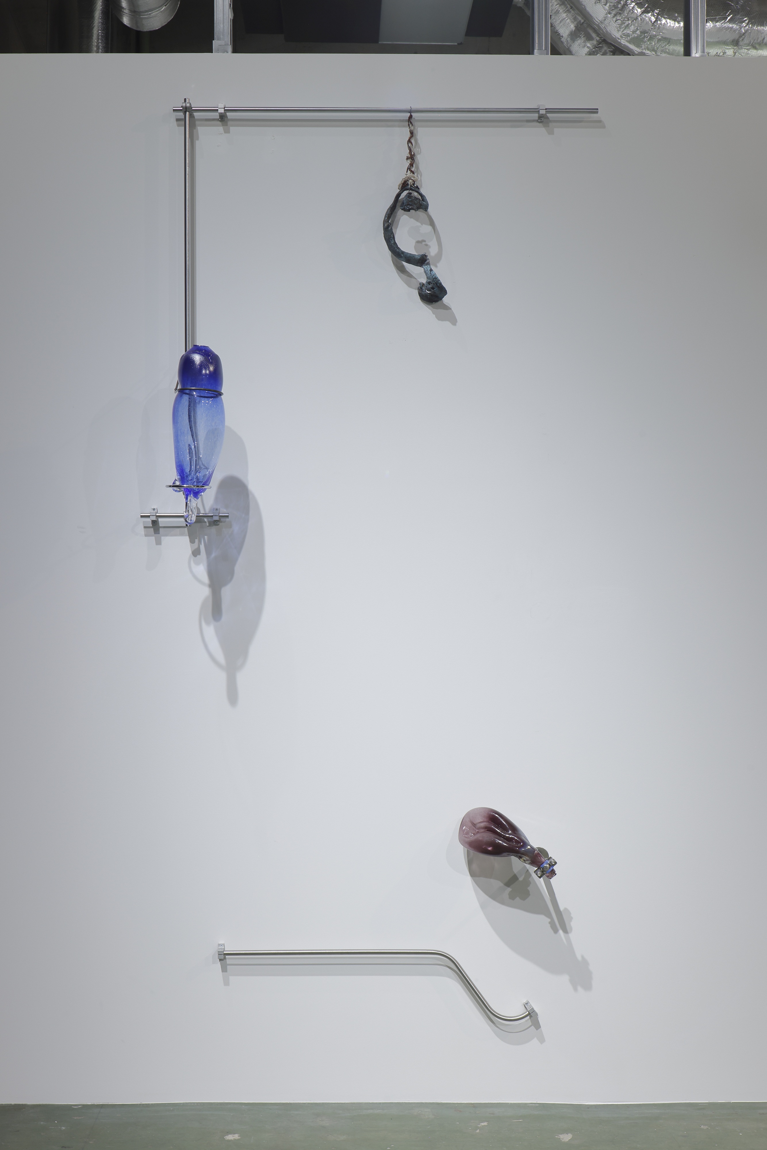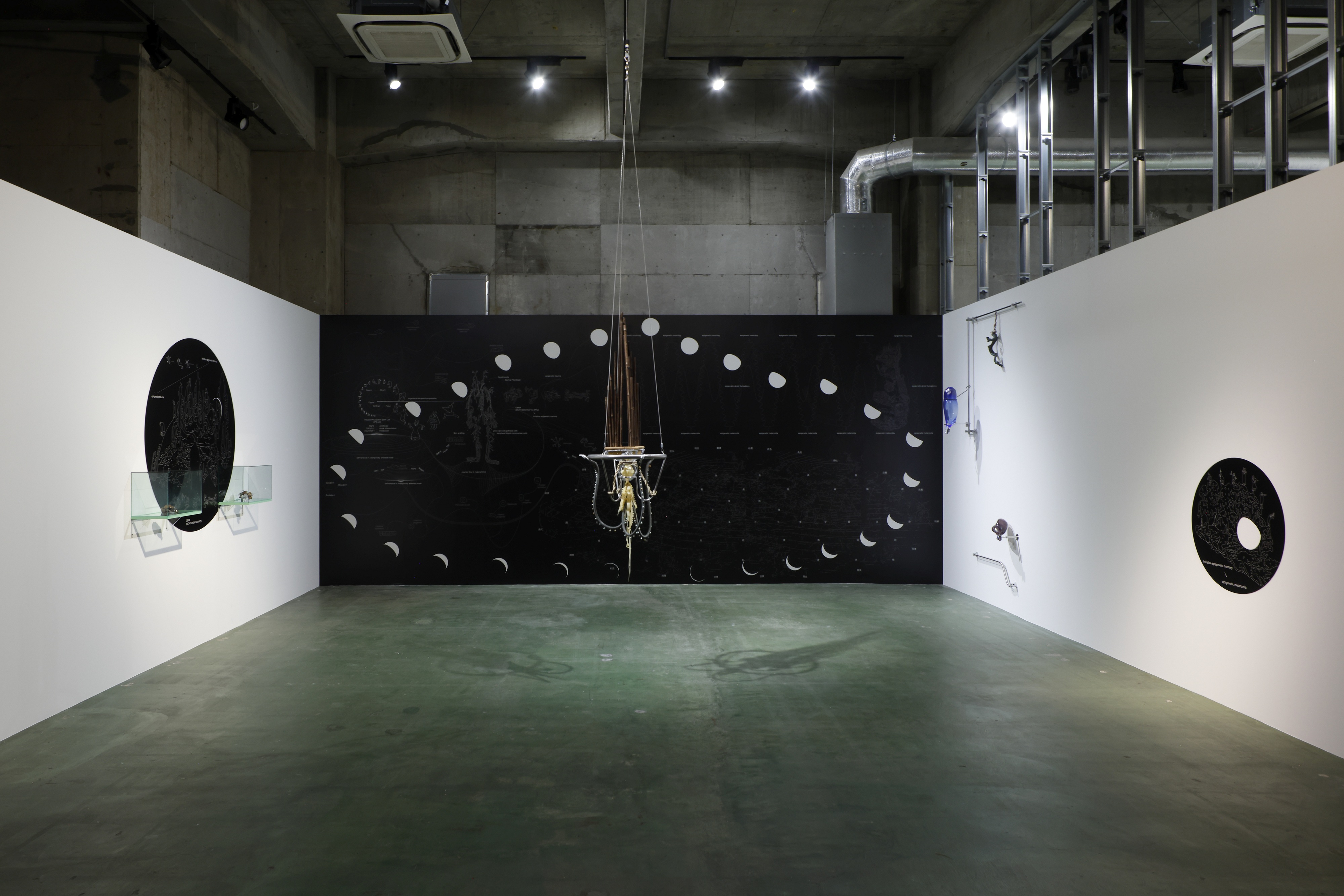 同じ空間内には、iPS細胞研究所で行ったリサーチをもとに制作された彫刻作品も並ぶ。受精卵が3つの胚葉に分かれ、異なる身体部位へと分化していく過程をモチーフに、ガラス、ブロンズ、金属という3つの素材で構成されている。身体を部分的に切り分けて捉える西洋医学的な視点に対し、谷中は中医学的な時間感覚も参照しながら、治療と時間の関係を探究している。