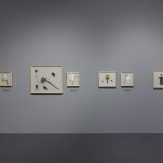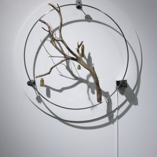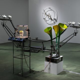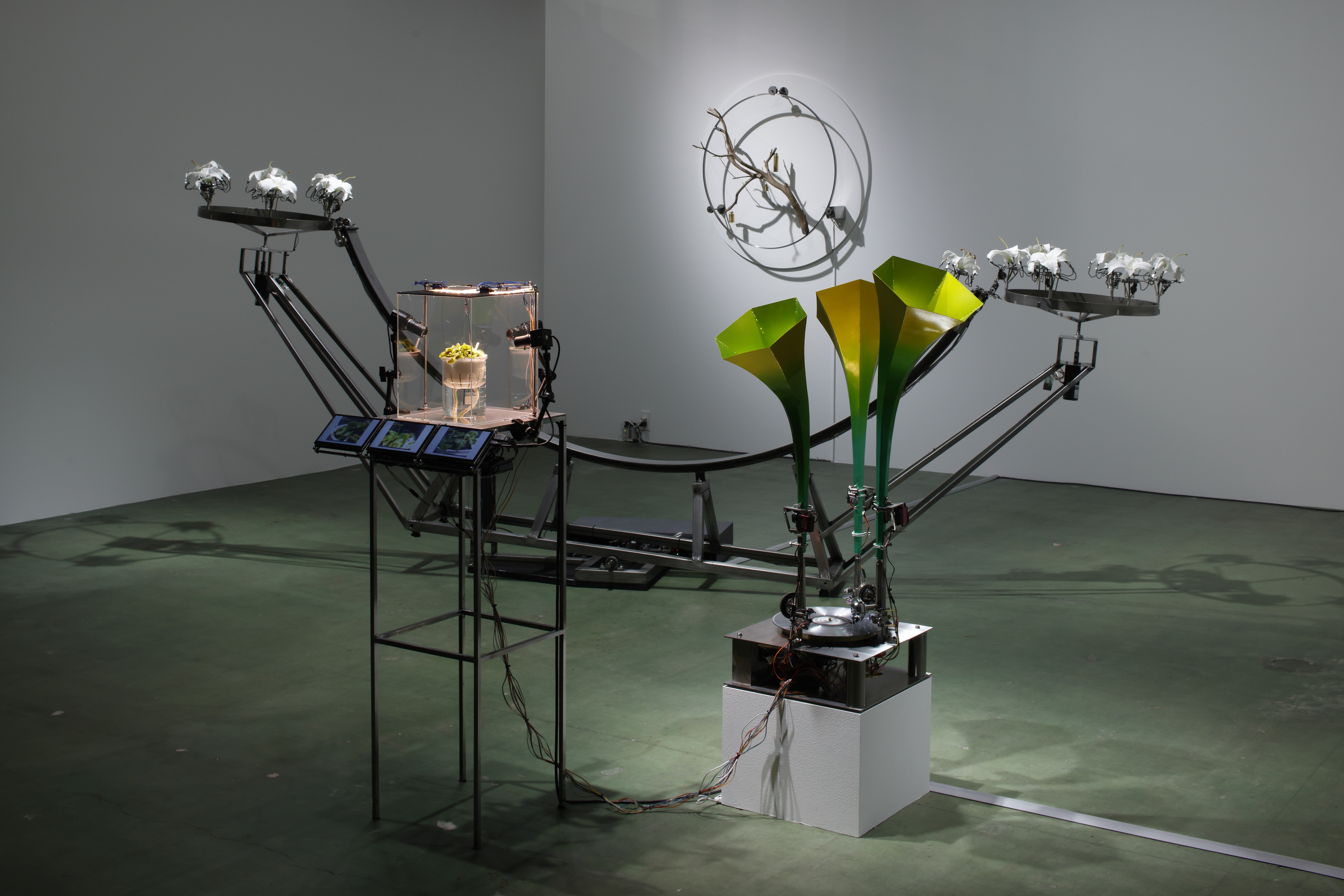 またユリ(会場の規制上、生花ではなく造花が用いられた)を使った作品では、本来は両性花であるユリのおしべとめしべを切り分け、ライン工場のようにひたすら受粉させ続ける器具を作り上げた。選択も合意もないまま、外から決められた条件の中で受粉が強制される本作を人間の生殖になぞらえると、なんと恐ろしいことか。一方、回転する輪に枝が巻き込まれそうになりながらも、人工的な重りによって直立状態を保たせる作品では、制御・矯正と抵抗のせめぎ合いが表現されている。
