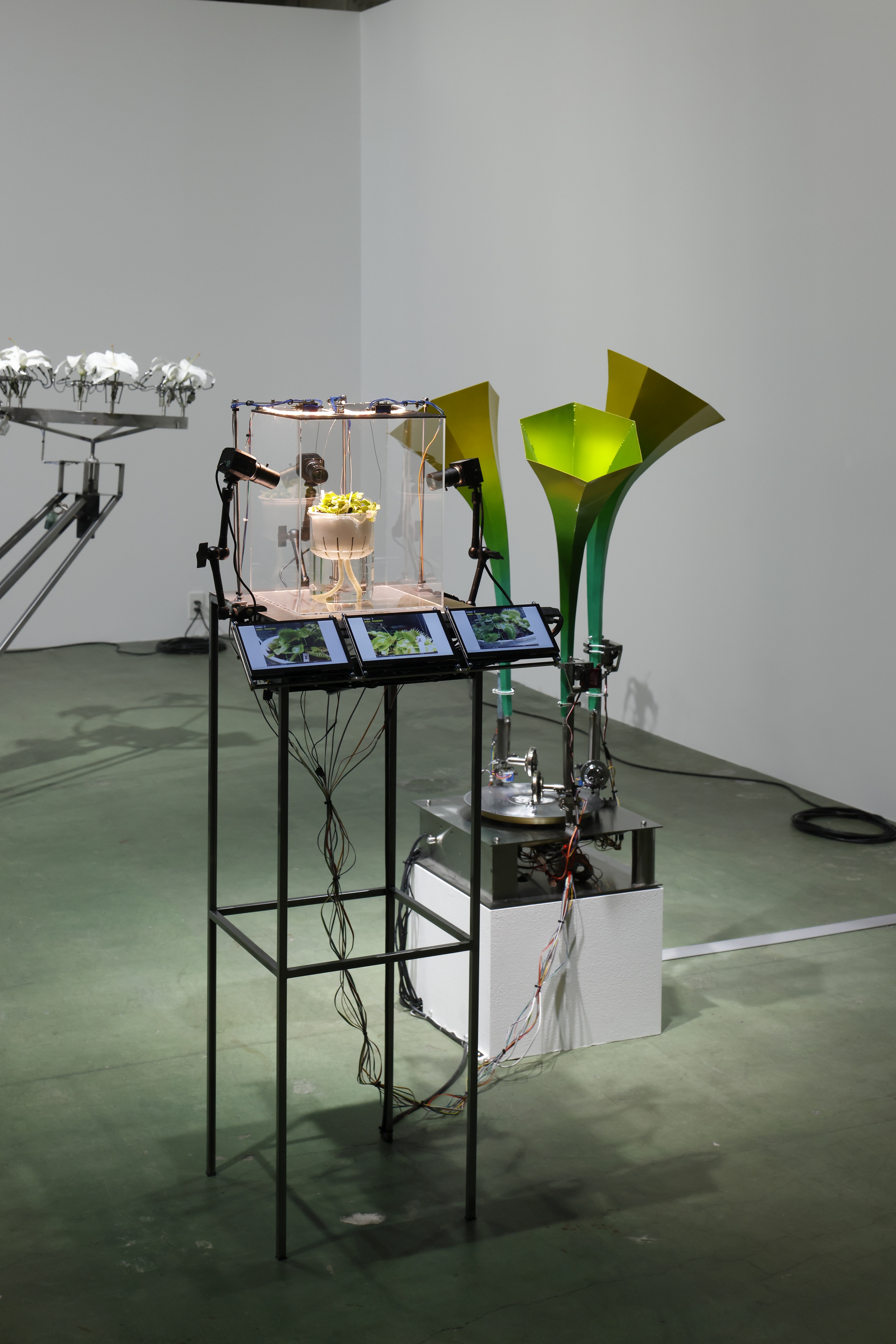 たとえばハエトリソウを使った作品では、本来、虫を捕食してエネルギーを得るために口を閉じる植物の動作を人為的に強制することで得た信号を、植物から繋げられたレコードプレイヤーに送ることで、音楽が再生される。