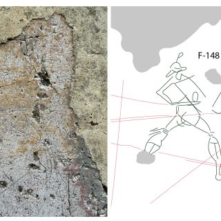 今回新たに確認された落書きの中で特に注目されるのが、劇場の観客席へと続く最初の階段付近、回廊南側の壁に刻まれていたグラディエーターの戦いを描いた図像だ。漆喰への刻みは非常に浅く、画像も部分的にしか残っていないが、RTIによって、鎧をまとった2人の人物が互いに対峙し、戦う様子がはっきりと浮かび上がった。