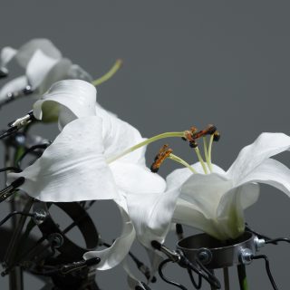 栄養にならない刺激に反応し続けるハエトリ草は人間の一方的なエゴを、止まることなく受粉を強いられるユリは選択や合意のない関係を、揺らぎの中で直立を保つ枝は強制と抵抗のせめぎ合いと、その均衡を表しています。「管理」や「制御」といった、一見ディストピア的に見える構造にあえてしたのは、私たちが無意識のうちに他者との関係の中で行っている行為を極端な形で提示し、鑑賞者に違和感や問いを投げかけると同時に、制作を通して私自身がそれらをより深く理解したいと考えたからです。