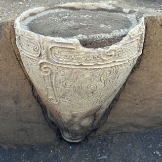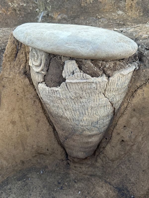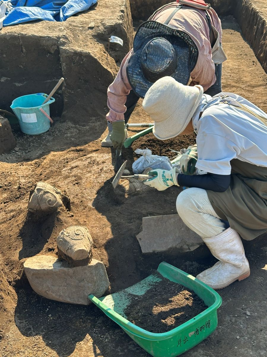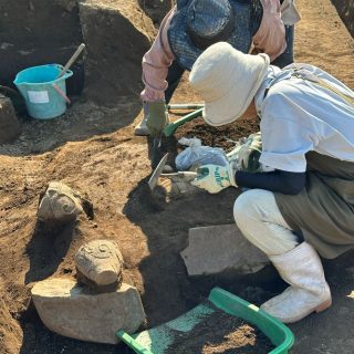 内訳は縄文中期が41軒、古墳時代16軒、平安時代17軒で、複数の釣手土器(*1)、祭祀に用いられたと見られる三角とう形土製品(三角柱状の土製品)、困った顔をしたような土偶、良好な保存状態の埋甕に使われた土器(*2)や石棒などが多数出土している。発掘の経過は平出博物館の公式インスタグラムで順次公開され、多くの「いいね」やコメントが付くなど関心を集めた。