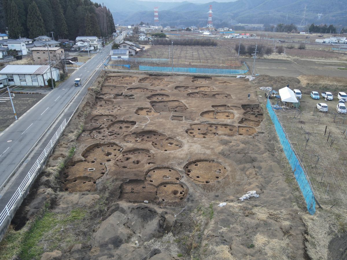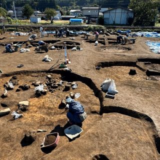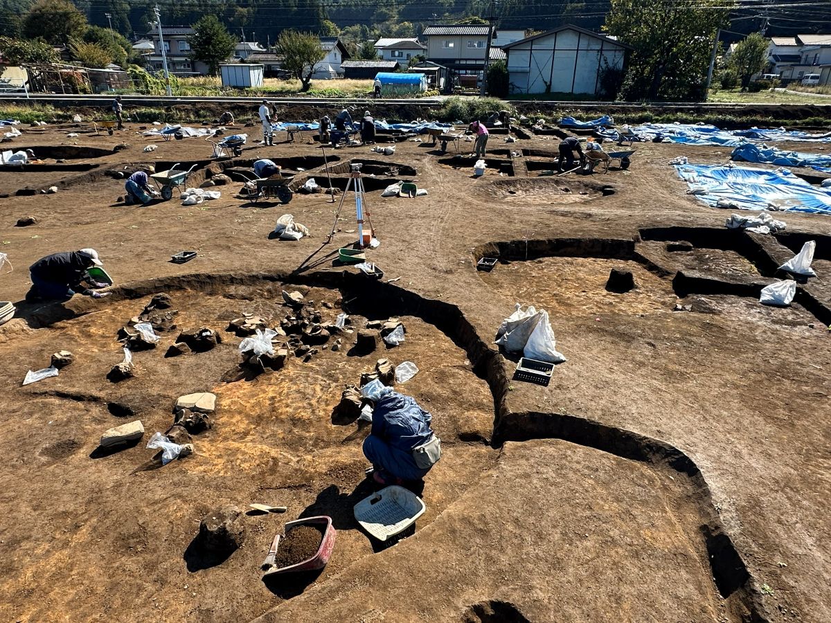 塩尻市の宗賀地区にある床尾中央遺跡で、2025年5月半ばから12月中旬にかけて大規模な発掘調査が行われ、縄文中期(約5100~4800年前)、古墳時代(4世紀頃)、平安時代(11世紀頃)の集落跡から、74軒にのぼる住居跡が発見された。