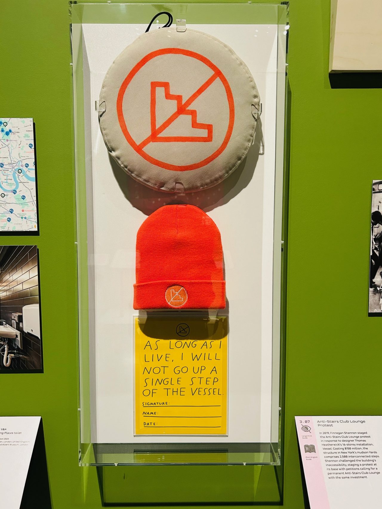 冒頭のベンチを作ったアーティストのフィネガン・シャノンは、トーマス・ヘザウィックが手がけたニューヨークの巨大パブリックアート、ベッセル(Vessel)が、2000段余りの階段を用いないとアクセスできない事実に対し、車いすユーザーなどの障がい者が起こした抗議活動「Anti-Stairs Club Lounge(アンチ・ステアーズ・クラブ・ラウンジ)」のために、帽子とクッションをデザインした。