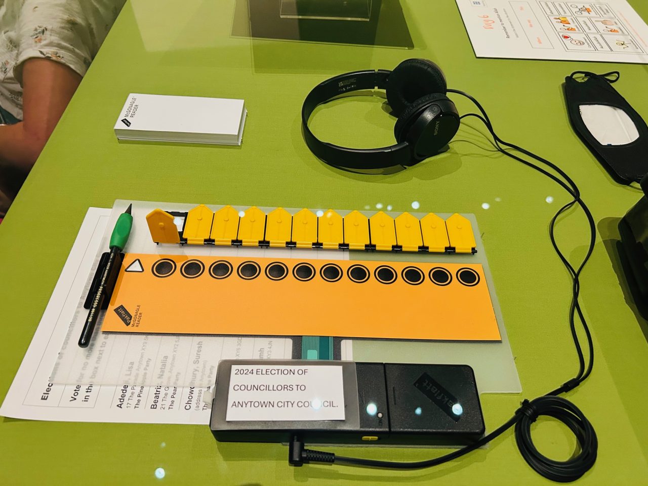 2024年のイギリス総選挙の際に一部で実用化されたのが、投票の際に、視覚障がい者がヘッドフォンをつけ、聴覚を頼りに投票用紙に書き込める道具「Mc Gonagle Reader(マクゴナグル・リーダー)」である。従来、聴覚障がい者は補助者に支持者や政党を伝えて書き込んでもらうのが通例だが、このツールがあれば、一人でプライバシーを保って投票することが可能だ。