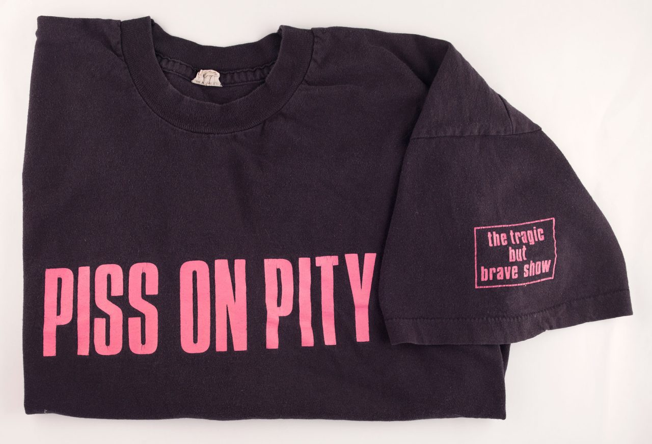 ショッキングピンクの文字で「Piss on Pity(哀れみなんてクソ喰らえ)」とプリントされた黒いTシャツは、浮き出た文字を触って鑑賞するよう促されている。1990年イギリスで活動家スー・エルスグッドらが結成した「DAN(Disabled People’s Direct Action Network)(障がい者の直接行動ネットワーク)」の抗議活動のために作られたユニフォームで、その後、このスローガンは幅広い障がい者たちの間で用いられた。