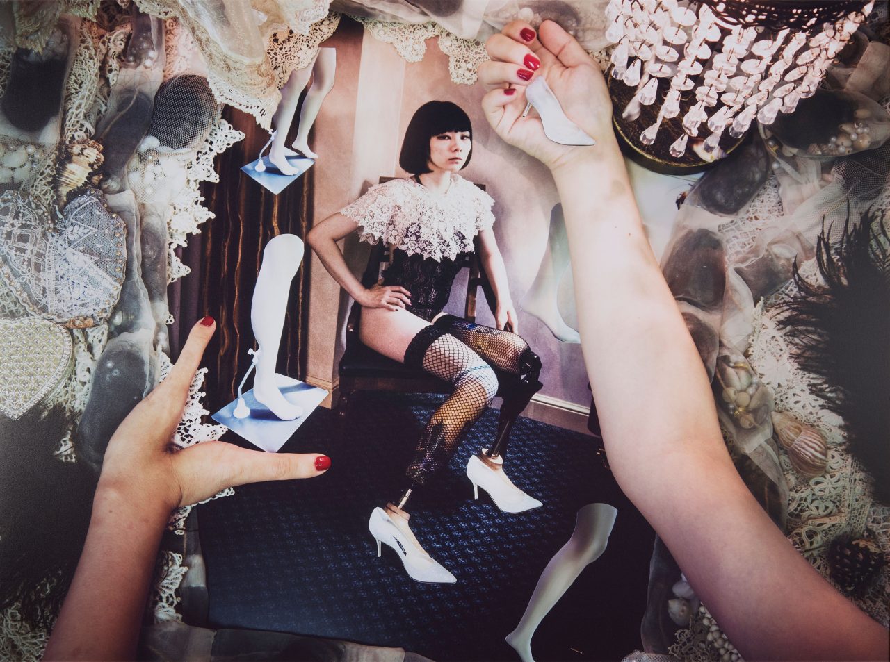 片山真理はセルフポートレート《just one of those things #002》(2021)で、イタリアのラグジュアリーシューズブランド、セルジオ ロッシが両義足ユーザーである片山のために制作した美しいハイヒールを履いている。非実用的な存在と言えるハイヒールを履くという選択肢は、すべての人に与えられる権利であるという主張を感じさせると同時に、身体の個性を高らかに謳い上げる写真は理屈抜きに私たちを魅了する。