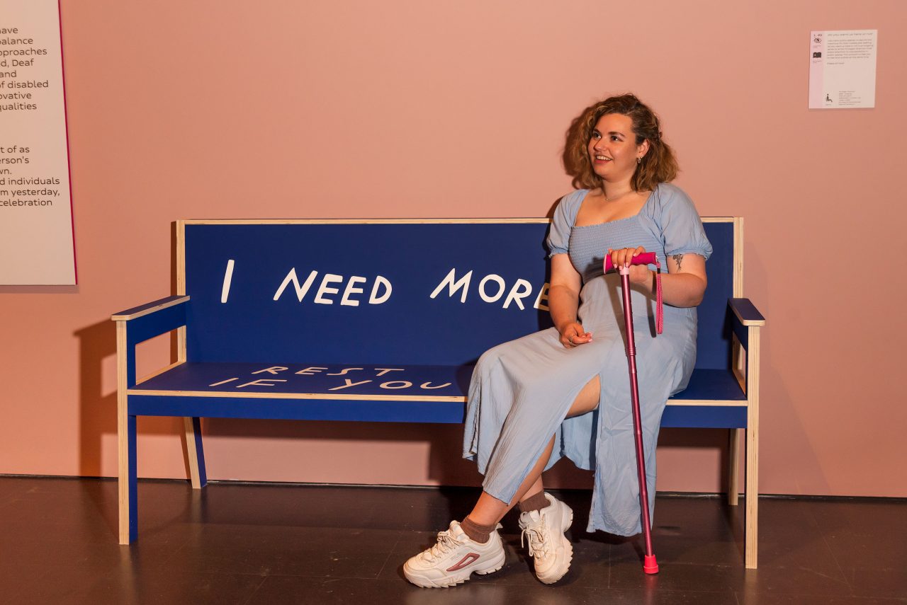 会場の入り口は、手話や点字を用いて展覧会について紹介するコーナーだ。ベンチの形をしたフィネガン・シャノンの作品《Do You Want Us Here or Not(私たちにここにいてほしいのか、そうでないのか)》が来場者を迎える。鮮やかな青のベンチには、白字で「私にはもっと時間が必要。同意してくれるなら、ここで休んで」と書かれてある。美術館を含め、多くの公共空間、いや、もしかしたら社会全体に不足している「とまり木」「とりつくしま」の必要性を訴える作品だ。