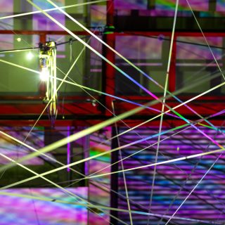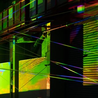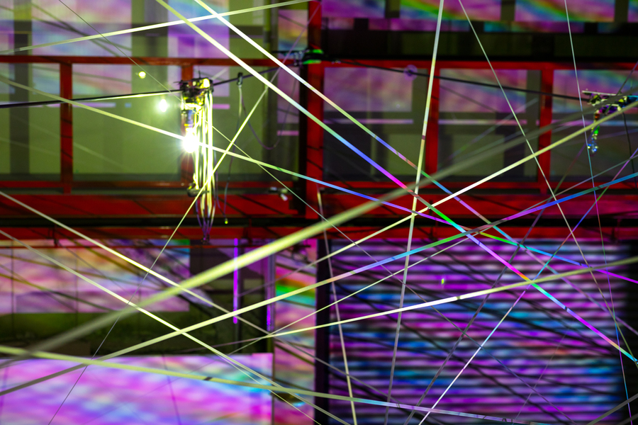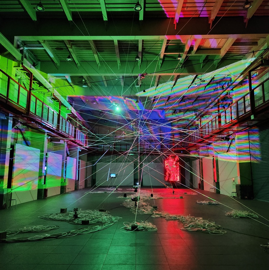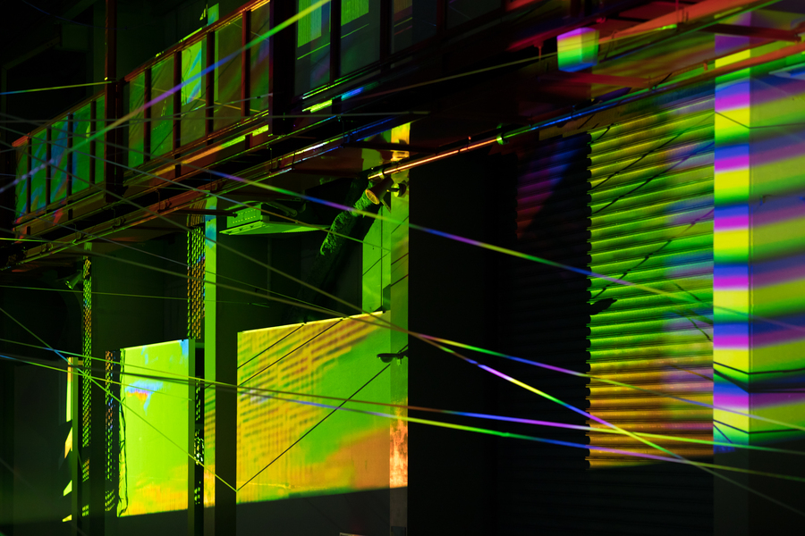 事実と虚構、自然と人工、人間とテクノロジーといった境界が揺らぐ時代において、私たちはどのように世界との関係を結び直すことができるのか。この問いに対して、それぞれ流動的な環境との関係性をテーマに制作してきたアーティストが集い、張り巡らされた構造体や投影される光、響き合う音が、刻々と変化する知覚体験を生み出す。都内最大級の展示空間を有するアートファクトリー城南島という場所性も相まって、カオスと秩序のあいだを行き来するような没入的な空間が広がる。