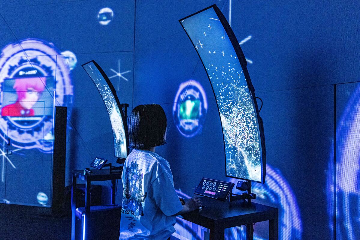 会場に足を踏み入れるとまず圧倒されるのが、広大なGallery A/B/Cを活用した空間設計だ。建築家・元木大輔率いるDDAAによる会場構成は、電脳ネットワークを思わせる「Nerve Net」のビジュアライザーと、中央にそびえる「World Tree: Ghost and the Shell」のドーム型インスタレーションで、訪れた瞬間から「攻殻の世界」と錯覚させる。虎ノ門のビル群と東京タワーがガラス越しに見えるロケーションも(日没後ならなおさら)、主人公・草薙素子が夜の街に潜行するあの有名シーンを想起させ、来場者を盛り上げる。会場自体が作品の一部になっているのだ。