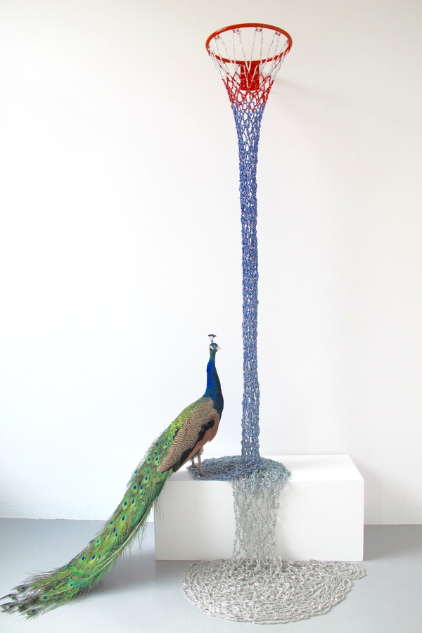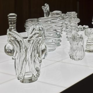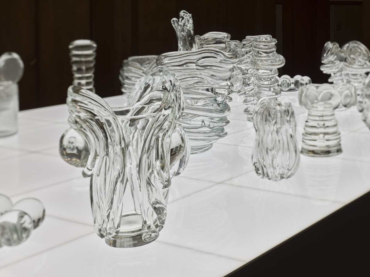 同じく2階では、ガラスビーズと安全ピンという装身具や交易品としての歴史をもつ素材を用い、膨大な手作業の集積によって日常の風景を幻想的に変容させるシゲ・フジシロの作品を展示。バスケットコートを想起させるモチーフが、運河に面した窓から差し込む光や天井のシャンデリア、室内に残る家具と呼応するかたちで配置される。また、ガラス産業の中心地として長い歴史をもつヴェネチア・ムラーノ島の熟練職人との協働を通じ、無色透明のガラスのみを用いた彫刻作品を制作してきた三嶋りつ惠は、35点からなる作品群を2階に展示する。