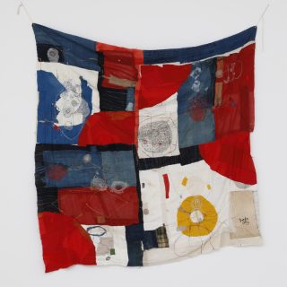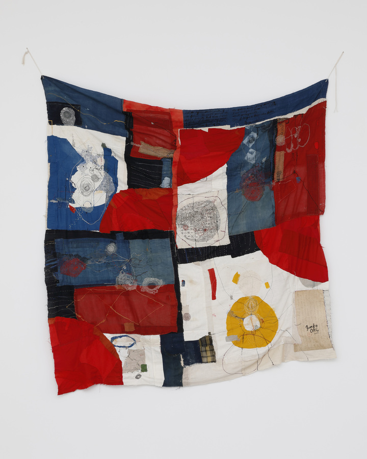 2階のかつて居住空間として使われていた部屋には、刺繍という反復的な手仕事を通じて、布に生活の時間と身体の記憶を縫い込む沖潤子の作品が展示される。長く家庭の内部に属するとみなされ、可視化されにくかった女性の労働の時間を、作品として静かに立ち上げる試みだ。
