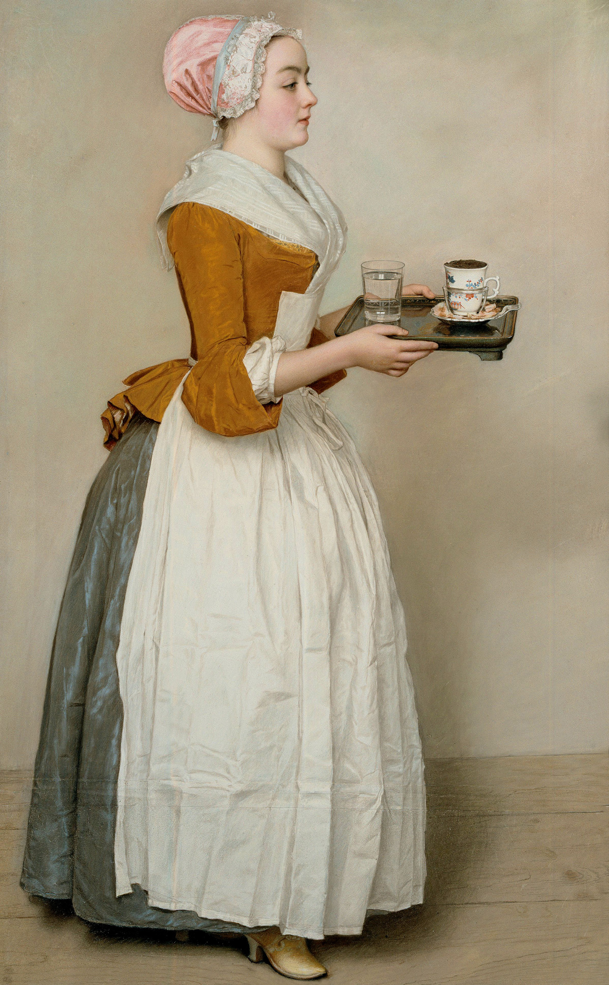 ジャン=エティエンヌ・リオタール(1702–1789)は、ジュネーヴに生まれ、18世紀ヨーロッパを静かに横断した肖像画家。パリ、ロンドン、ウィーン、さらにはコンスタンティノープルへと旅しながら、宮廷人や知識人、市井の人々までを描いた。とりわけパステルの名手として知られ、肌に射す柔らかな光、シルクのひだ、ガラス器に映る透明な反射を、驚くほど克明にとらえた。その筆致はロココの華美な装飾性とは距離を取り、理想化を抑えた観察のまなざしによって、人物の内面にひそむ静けさを浮かび上がらせている。代表作とも言える本作《ショコラを運ぶ娘》に見られるのも、そうした誠実なリアリズムである。白いエプロン姿の若い給仕の女性が、こぼさぬよう慎重にカップを運ぶ。その一瞬の均衡が、ほとんど等身大のスケールで画面に留められる。モデルの身元は定かではないが、ウィーンの菓子店で働く娘が貴族に見初められたといった逸話や、銀行家の娘や伯爵夫人であるという説も残る。そんな後世の物語さえも包み込むように、リオタールの描線は静かで、透明だ。1789年、ジュネーヴにて86歳で死去。現在はドレスデンのアルテ・マイスター絵画館に所蔵されている。