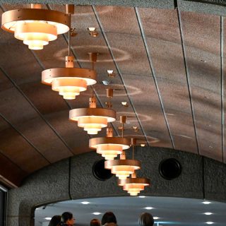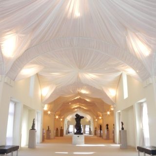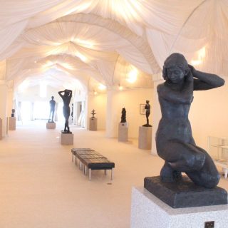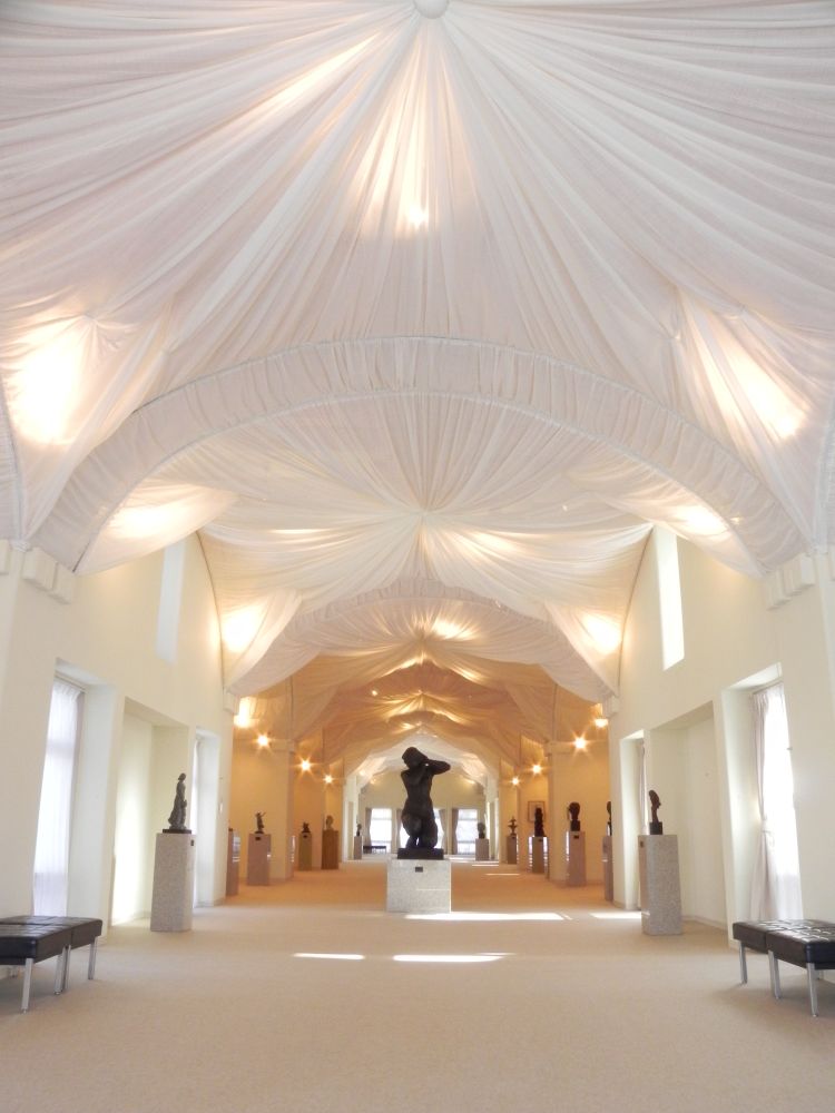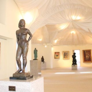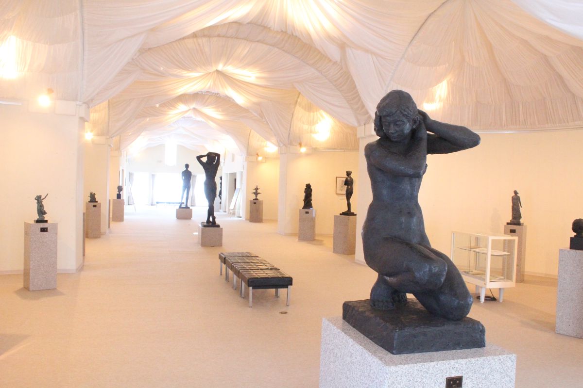 村野が設計を手がけた八ヶ岳美術館が、長野県の原村に開館したのは1980年。八ヶ岳の山麓にある原村出身で文化功労者の彫刻家、清水多嘉示から作品の寄贈を受けたことをきっかけに、当時は全国的にも珍しい村立の美術館として創設された。外観は半円形の屋根が連なるユニークな形状で、エントランスを入ると奥行き40メートルほどの空間が広がり、いくつものドーム型の天井に包み込まれるような感覚になる。そうした印象を演出しているのは、丸い天井に絞り吊りされたレースカーテンと、その中に設置されたスポット状の間接照明だ。レースが生み出す柔らかい光と軽やかな空気感に満ちた空間は、それ自体が没入型インスタレーションのようでもある。