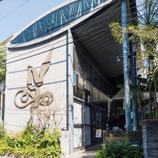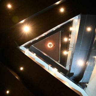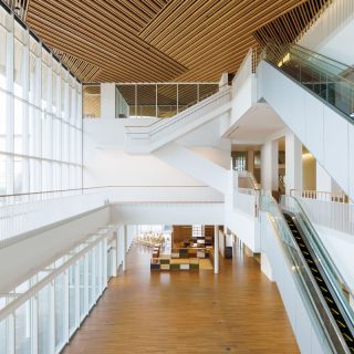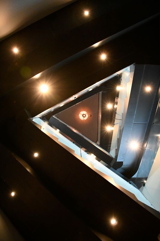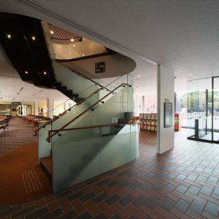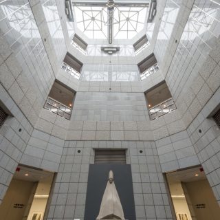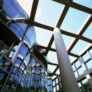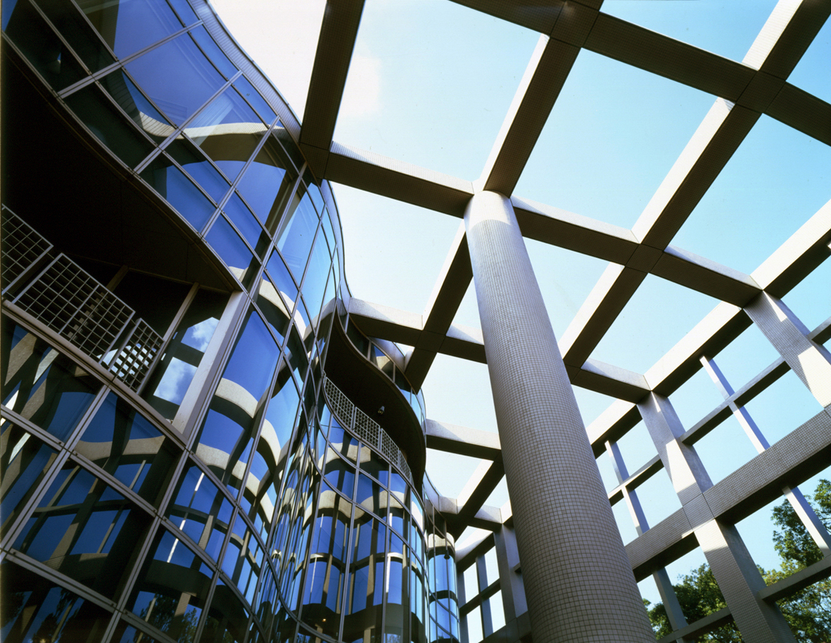 1982年に開館した埼玉県立近代美術館は、黒川が初めて手がけた美術館だ。格子状の柱梁構造と、正面入り口手前の三角に突き出た構造体がシャープな印象を与えるが、建物のファサードは対照的に柔らかく波打つような曲面ガラスで覆われている。この曲面は、最晩年の作品である国立新美術館のガラスカーテンウォールのルーツと言えるかもしれない。建物中央のアトリウムは地階から3階までを貫き、天窓から自然光を採り入れるとともに、展示物を天井から吊るしたり、ミュージアム・コンサートに利用されたりしている。また、下から見上げた天窓は、息を呑むような幾何学的美しさを放っている。