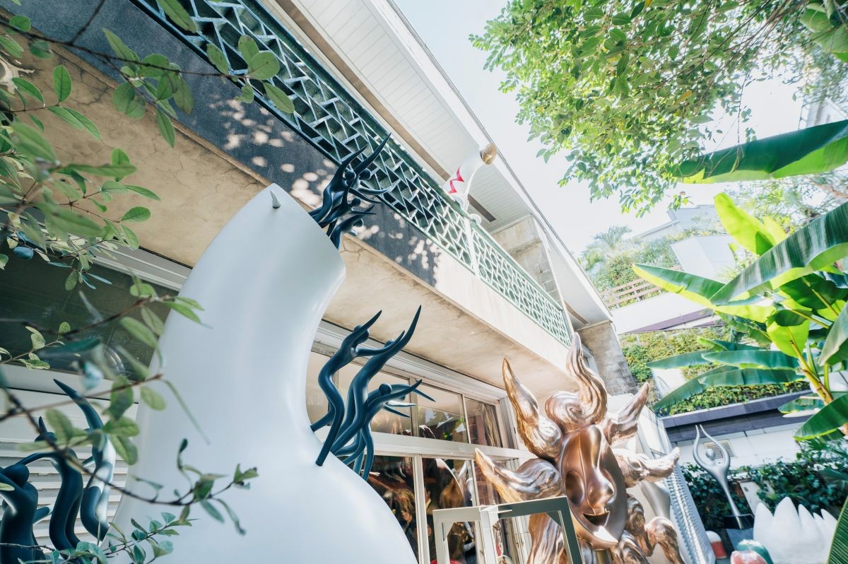 岡本太郎記念館はもともと住居兼アトリエとして設計されたもので、太郎が42年にわたって住まい、作品を作り続けた場所だ。1998年に公益財団法人が運営する公的なミュージアムとして公開され、現在は1954年に坂倉が手がけた旧館と、書斎と彫刻アトリエがあった木造の建物を建て替えた新館(展示棟)で運営されている。旧館はコンクリートブロックを積み上げた壁に2階の床と屋根を木造で建造した構造で、凸レンズを横に並べたような独特の形状の屋根が、直線的でシンプルな外観のアクセントになっている。
