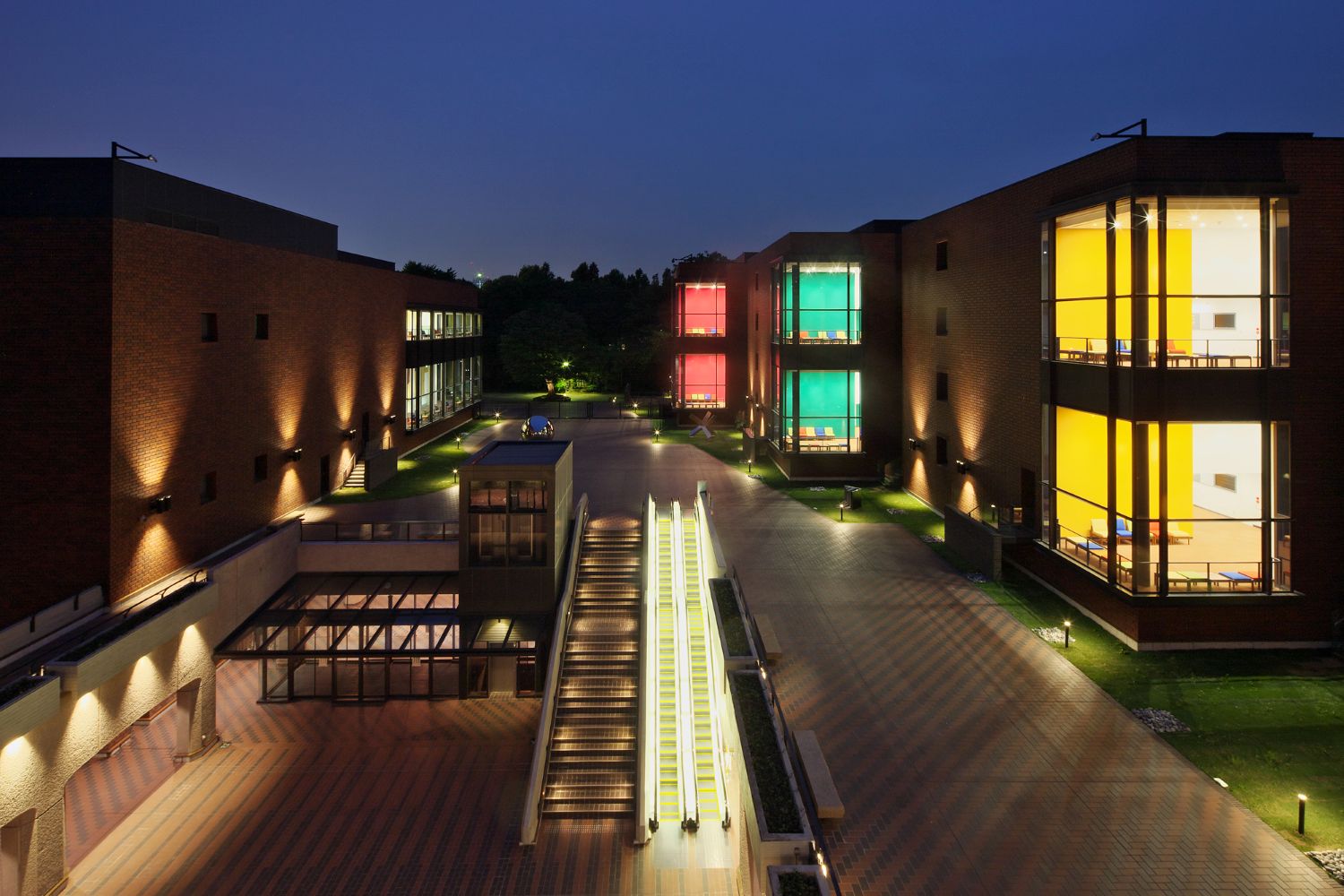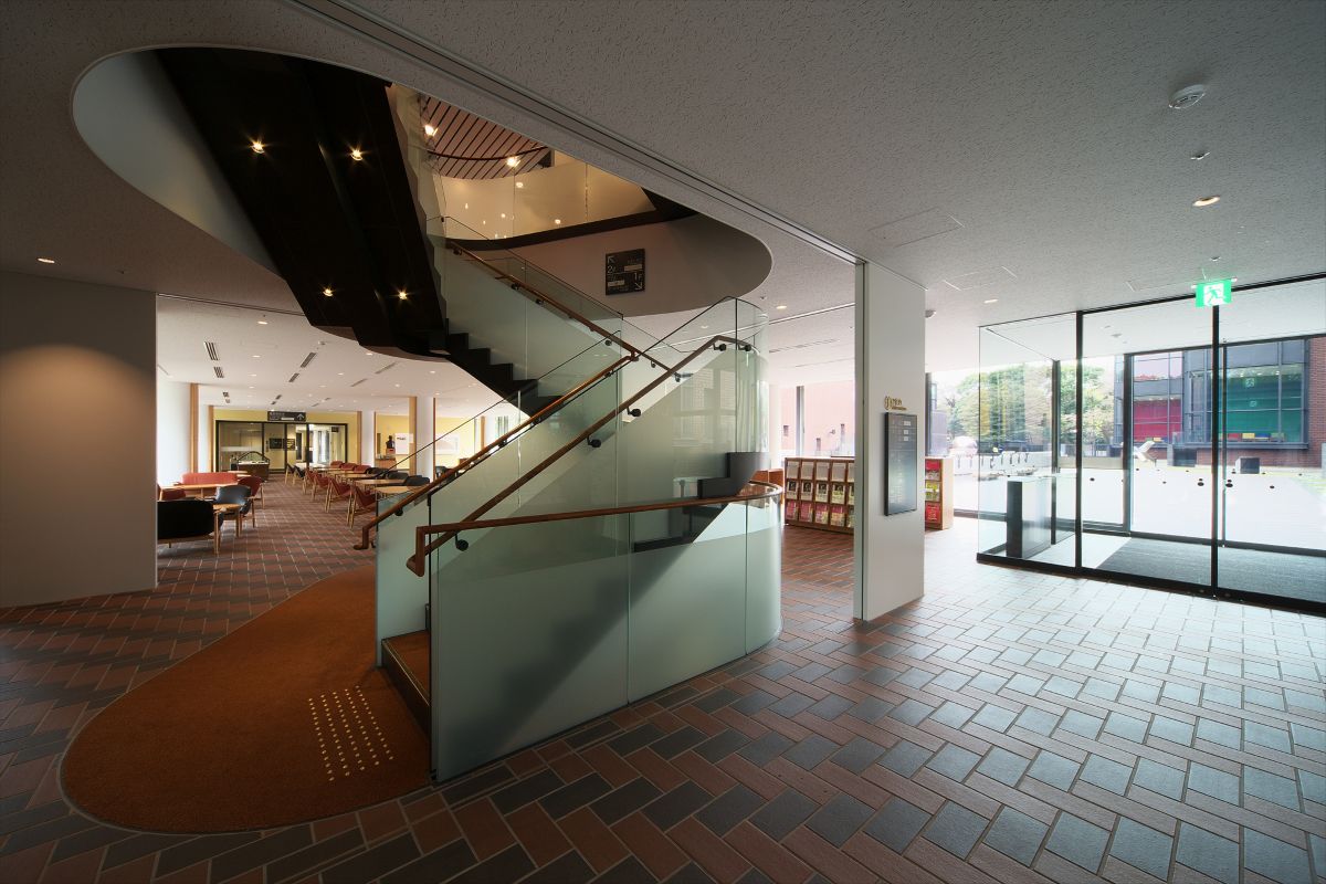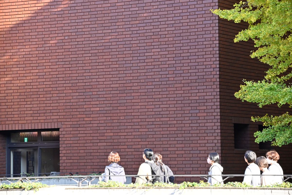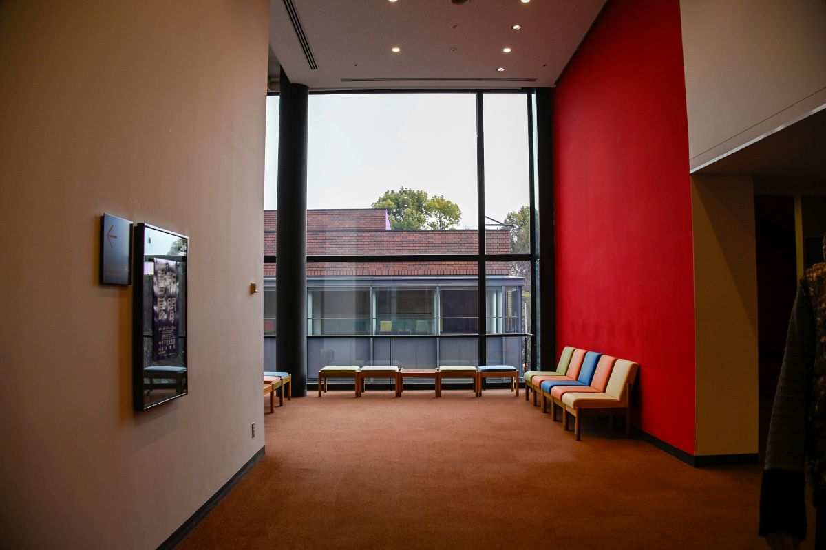 東京都美術館は、1975年の新館建築時に企画展の開催、公募展の開催、教育普及事業の展開という3つの機能を備えることが求められ、風致地区である上野公園内に立地するために建築上の制限も少なくなかった。そうした諸条件を満たすため、前川は地上から一段下がったところに広場を設け、上記3つの機能を持つ建物をそれぞれ独立したブロックとして広場の周囲に配置した。外観は、前川が開発した打ち込みタイル(*2)のレンガ色が、周囲の木々の緑との心地よい調和を生み出している。もう1つの特徴は、「前川カラー」と言われるカラフルな色彩が各所に配されていることだ。たとえば、少しずつずらした4つの建物が連なる公募棟の休憩スペースには赤、緑、黄、青に塗られた壁があり、屋外からもガラスウォールを通してこのアクセントカラーを目にすることができる。なお、同館は2010-2012に改修工事を実施した。