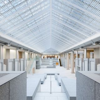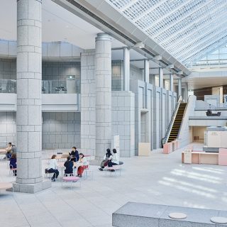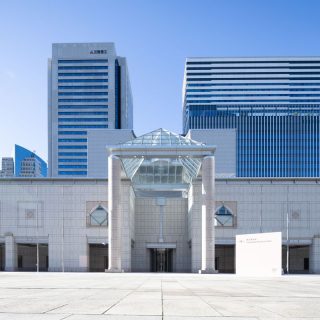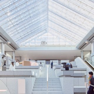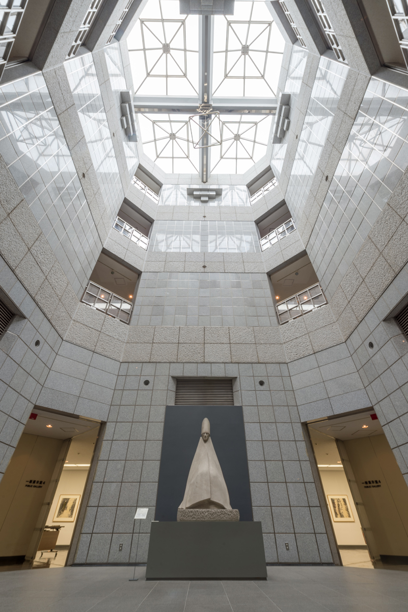 1989年に横浜博覧会のパビリオンとして開館した横浜美術館は、丹下が美術館として国内で初めて手がけた建築だ。広々としたグランモール公園に面し、左右対称に長く伸びる建物の外壁には、同館の特徴的モチーフである丸と四角を組み合わせた「フォルス・ウィンドウ」(にせ窓)と呼ばれる意匠が施されている。圧巻なのは御影石をふんだんに用いた大空間「グランドギャラリー」で、吹き抜けの天井は最頂部で約16mの高さがある。開閉式のルーバーが取り付けられたガラス張りの天井から自然光がたっぷり取り込まれ、左右約63メートルに広がる階段状の展示空間を満たすさまは開放感に満ち溢れている。