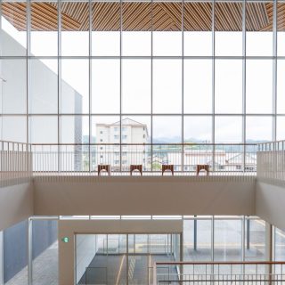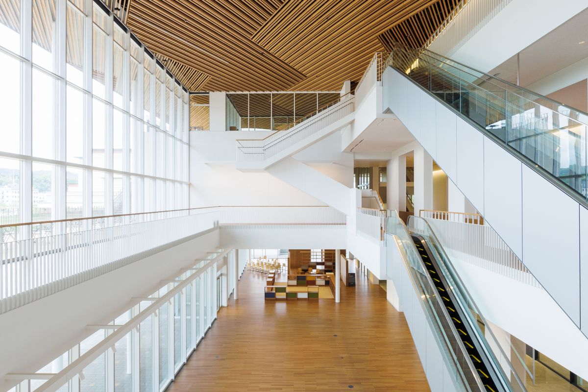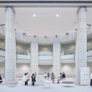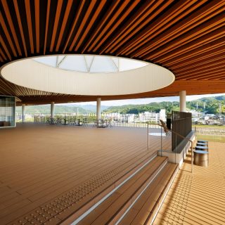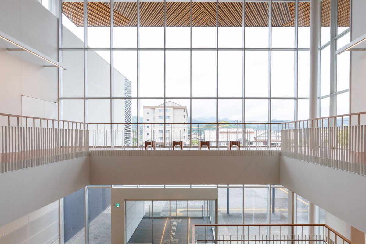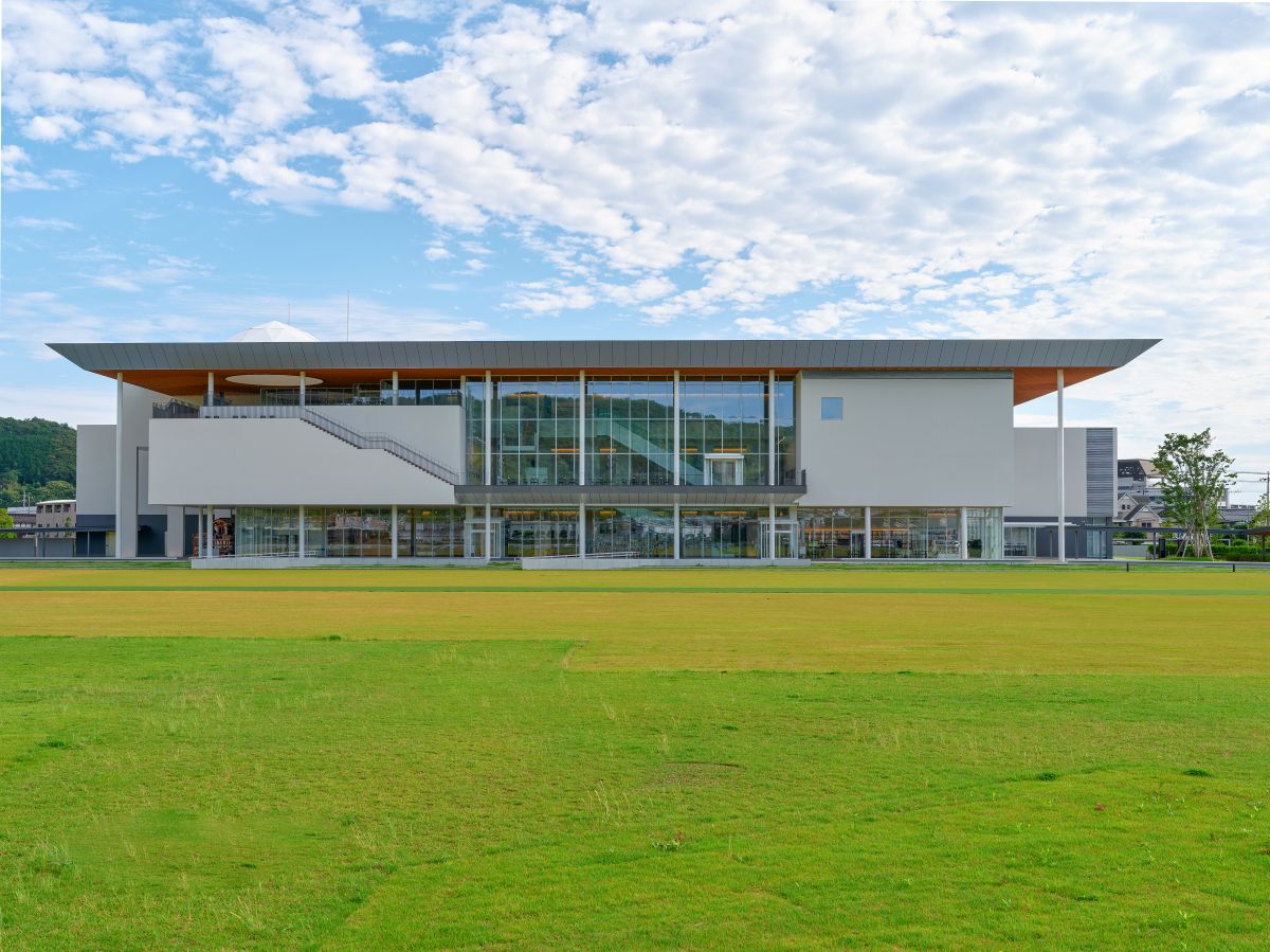 槇が亡くなる約2カ月前の2024年3月末に竣工し、翌年3月に開館した鳥取県立美術館の建物は、「OPENNESS!」という同館のブランドワードを体現する明るく開かれたガラスのファサードが大きな特徴だ。自然光が差し込む3階まで吹き抜けの大空間は「ひろま」と呼ばれ、ガラス窓の外側にあるテラス「えんがわ」とともに親しみやすい開放感を演出している。また、3階には約1000平方メートルもの柱の無い企画展示室があり、展望テラスからは隣接する国指定史跡・大御堂廃寺跡が一望できる。地元の伝統工芸である倉吉絣の織模様をモチーフにした、展望テラスの杉材の天井も印象深い。