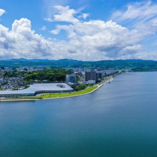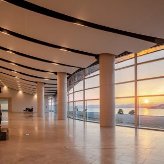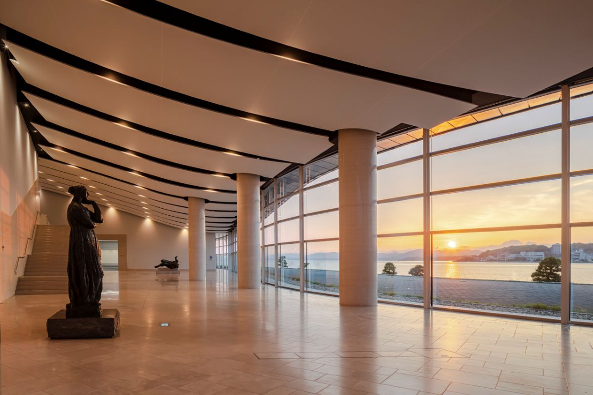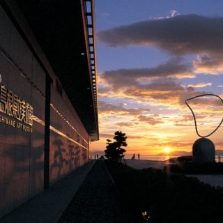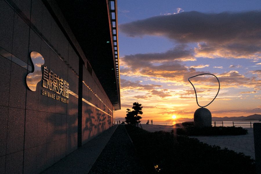 宍道湖に面し、水との調和をテーマとした島根県立美術館は1999年に開館。水面と大地をつなぐ「洲浜」をイメージした美しい曲線を持ち、対岸から見たときに周囲の山並みの景観をさえぎらない高さに設計された建物は、その意図どおり見事に風景と一体化している。大屋根には菊竹建築の特徴の1つであるチタンが用いられ、日の光をやわらかく反射するさまは湖面のようにも感じられる。ロビー空間は天井が高く、波状のカーブを描くガラスウォール越しに美しい湖の景色が広がる。このロビーや屋根の丸い開口部に設けられた展望テラスから見える夕景は、「日本の夕陽百選」にも選ばれている絶景だ。