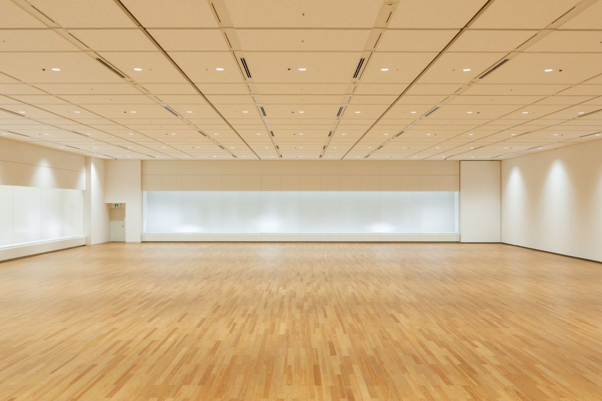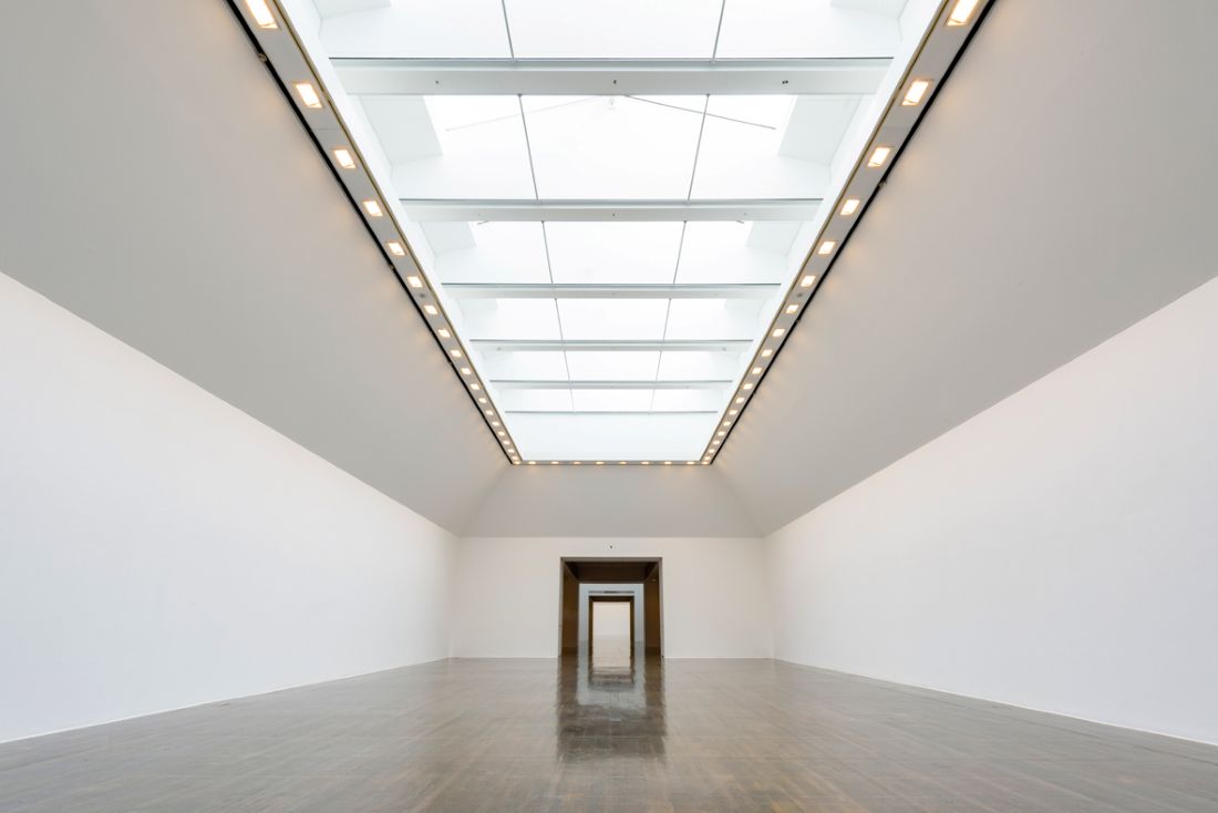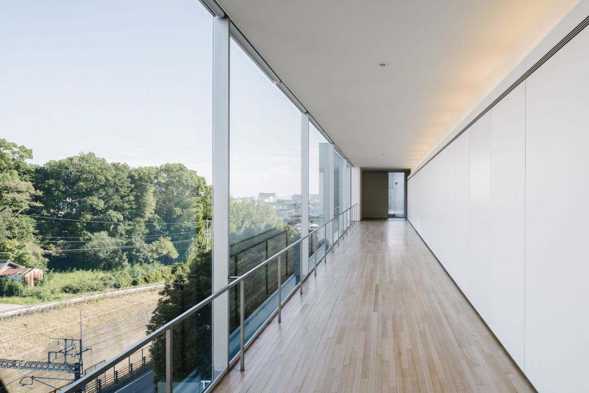 豊田市美術館は1995年、かつて挙母城(ころもじょう)のあった高台に開館した。美術館へと登る緑に囲まれたアプローチはあえて屈曲させてあり、ある地点で水平に伸びる巨大なグリッド状のファサードが目に飛び込んでくる。前庭に配置された大池に映り込む建物と、広々とした空は息を呑む美しさだ。巨大なファサードとは対照的に、正方形の壁に目隠しされた控えめなエントランスから中へ入ると、乳白色のすりガラスから取り込まれた柔らかな外光に包まれる。また、部屋ごとに空間の使い方や材質が異なる展示室や、ところどころで屋外の景色を楽しめる動線は、鑑賞体験に心地よいリズムを与えてくれる。