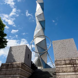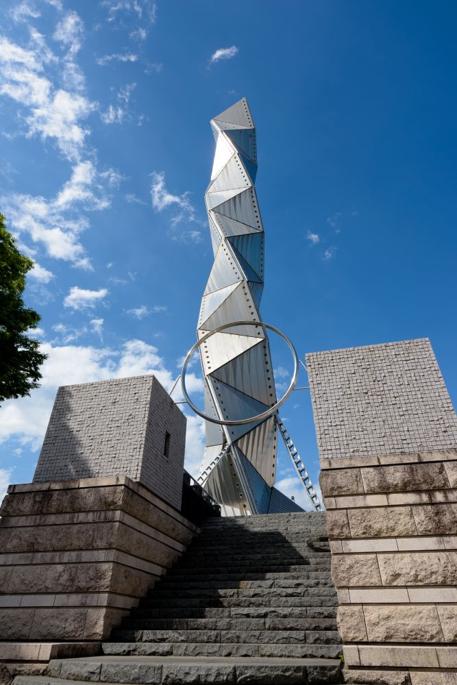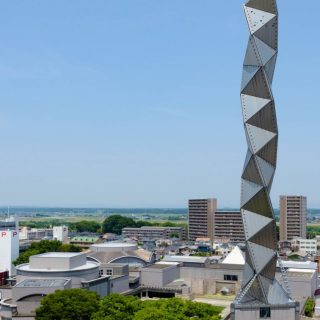 1990年に開館した複合文化施設の水戸芸術館にも、画一性を排した磯崎の特徴がよく表れている。特に、一辺9.6m、厚さ1.5mmの正三角形のチタンパネル57枚を三重らせん構造状に積み上げた高さ100メートルのシンボルタワーの存在感は強烈だ。主要施設であるコンサートホールATM、ACM劇場、現代美術ギャラリーの3つの専用空間は広々とした芝生の広場を取り囲むように配置され、それぞれ六角形、円柱と立方体、ピラミッドという異なる要素が取り入れられている。その外観は古典的にも未来的にも見える独創的なものだ。