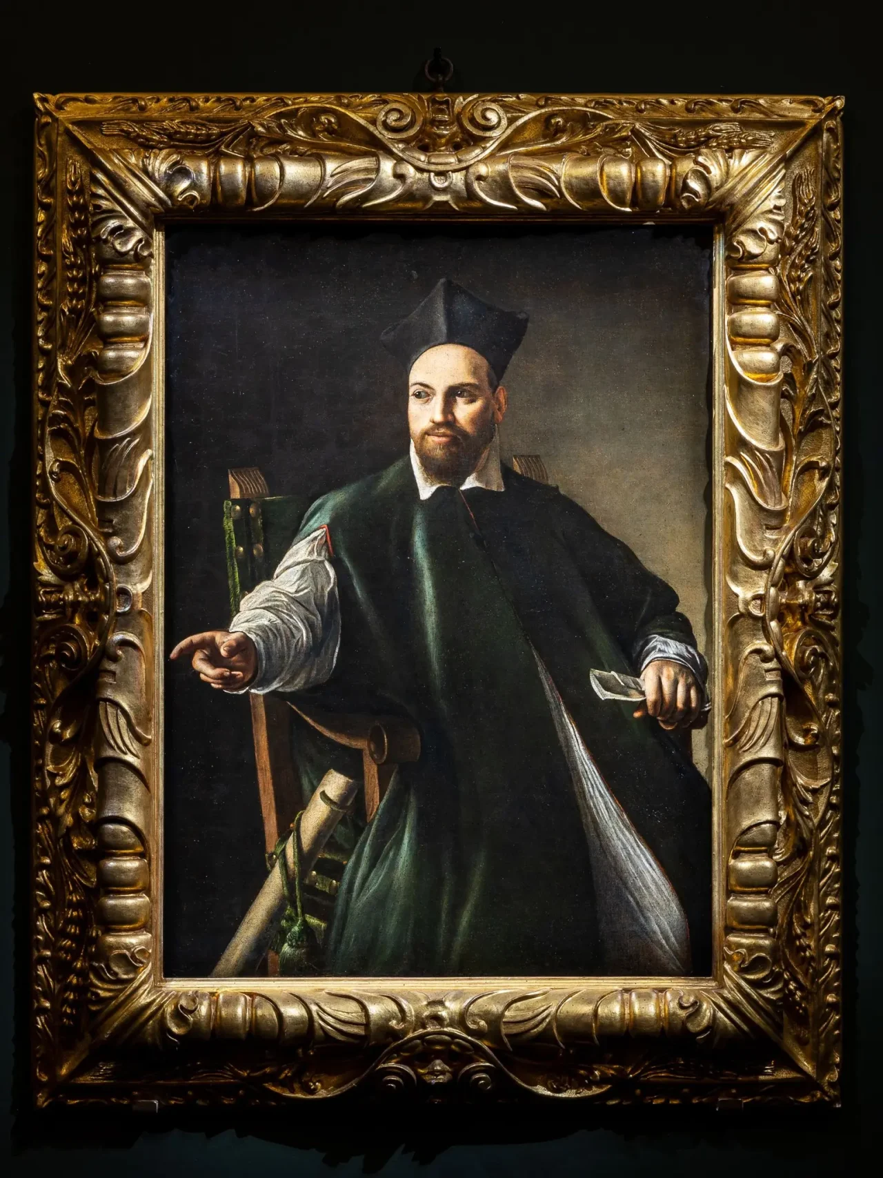 《マフェオ・バルベリーニの肖像》は、後に教皇ウルバヌス8世となるマフェオ・バルベリーニを描いた作品で、カラヴァッジョによる肖像画として確実に帰属されるわずか3点のうちの1点だ。1598年当時30歳だったバルベリーニは、華やかな緑色の聖職者のマントをまとい、右手を前に差し出して画面外の人物に命令を下している。こうした構図は、彼が後に権力の座へ上り詰めることを予示しているかのようだ。バルベリーニは1623年に教皇に選出され、1644年に死去するまでその地位にあり、芸術の庇護者としても知られる存在となった。