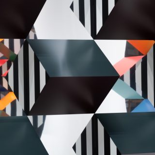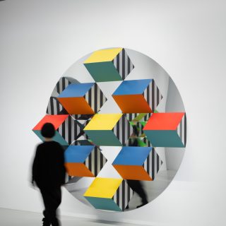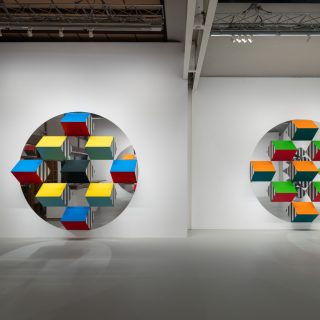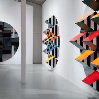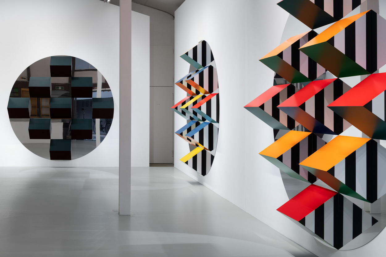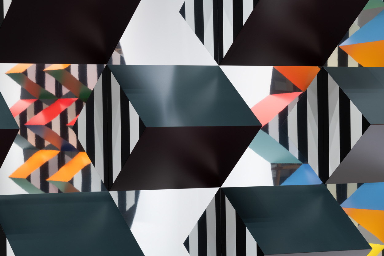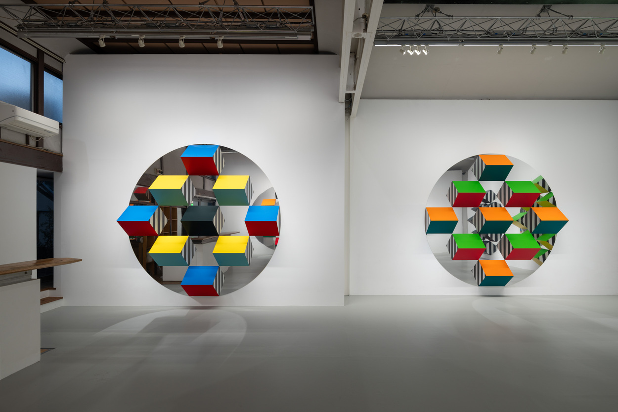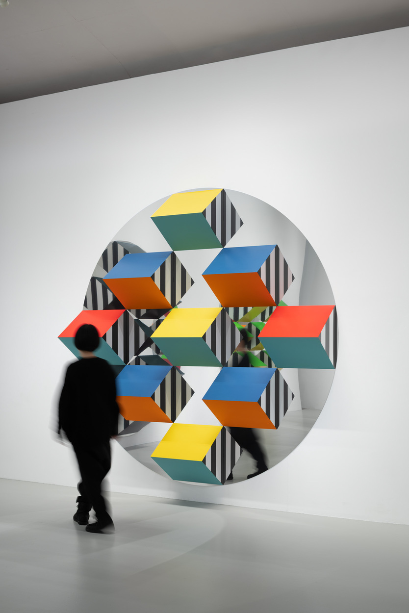 本展では、新シリーズ「Prismes et mirroirs : Haut-relief」を発表する。鏡面の支持体の上に、凸状のプリズム形状に彩色されたパーツが配置され、周囲の空間や鑑賞者の姿を取り込みながら、作品と環境の関係を可視化する構造となっている。正面に立っても自分の全身像が現れないという仕掛けは、視覚のあり方そのものを問い直す。ビュレンはかつて京都で日本庭園の「借景」の思想に触れ、制作概念を深めたという。本展は、その視覚と言語の探究を現在の文脈で提示する試みでもある。