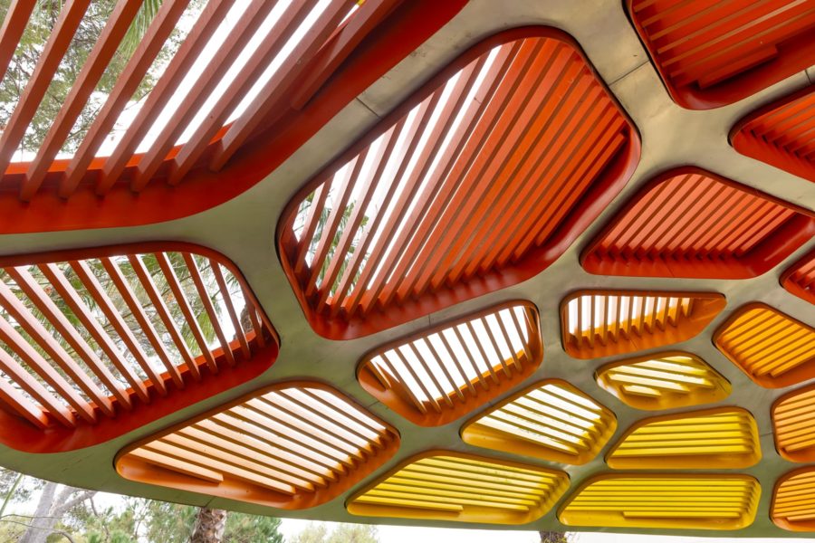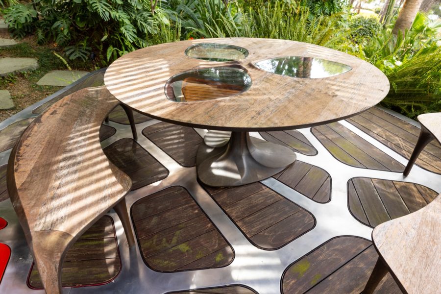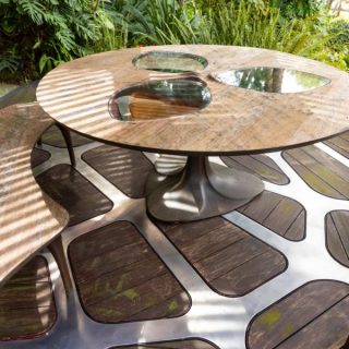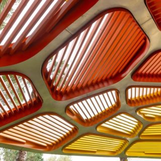 スチールとアメリカンオークでできたパビリオンの面積は約20平方メートルで、土台の複数の流線が中央の軸へと収束しながら屋根として立ち上がる構造だ。設計事務所が「動的かつ没入的な空間体験」と表現する構造物は、一見すると一体の塊のように見えるが、実際にはレーザーカットされた多角形パーツを複雑に組み合わせ、鋼製の骨組みに統合したもの。中には、テーブルと3脚のベンチが備えられている。各要素はザハの事務所が推進した設計思想「パラメトリックデザイン」によって数値的に最適化されており、製造上の制約を満たしながら使用材料を最小限に抑えるよう設計されている。