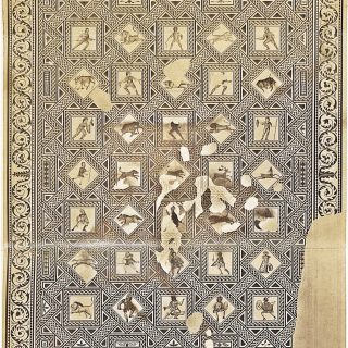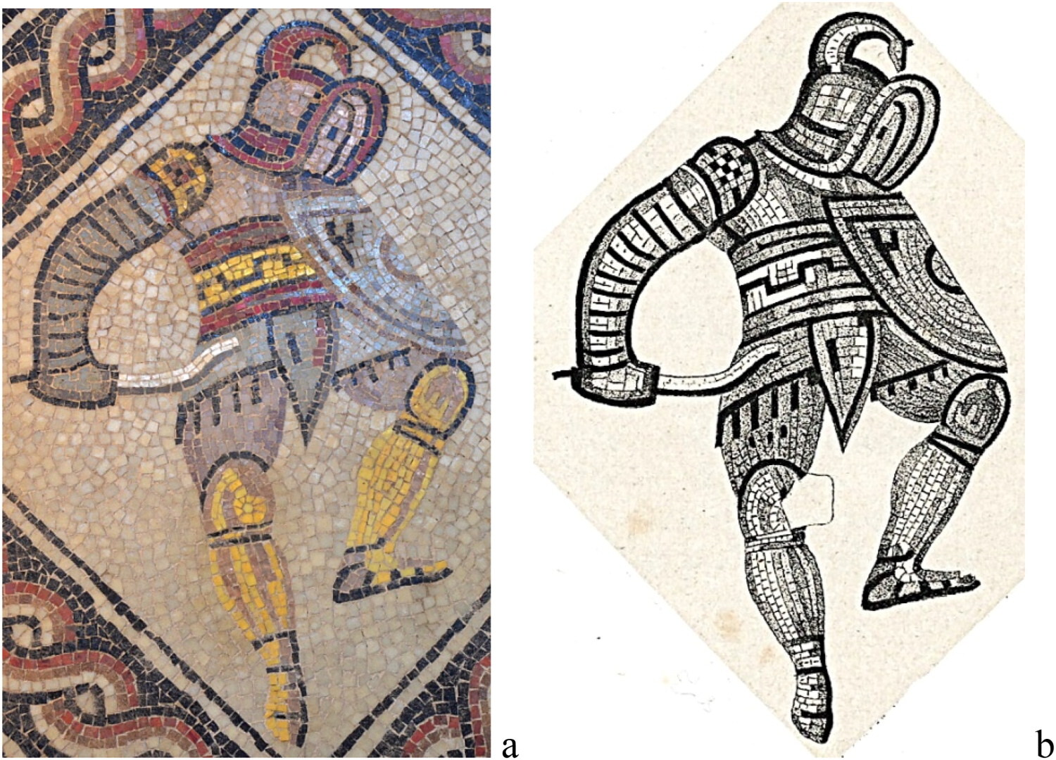 このモザイク画は、考古学者のジャン・シャルル・ロリケによって1860年にランスで発見され、闘技場の場面を描いた35の円形装飾で構成されている。ロリケはその後1862年に図版として出版した。しかし、彼が発見したモザイク画は第一次世界大戦の爆撃によって破壊され、現在はロリケが残した図版のみが資料として残っている。ただし、トラキア人風の装備をまとった剣闘士を描いたメダリオンの断片が現存しており、ロリケの図版と正確に一致することから、失われた部分を含む図版全体の信頼性も裏付けられている。