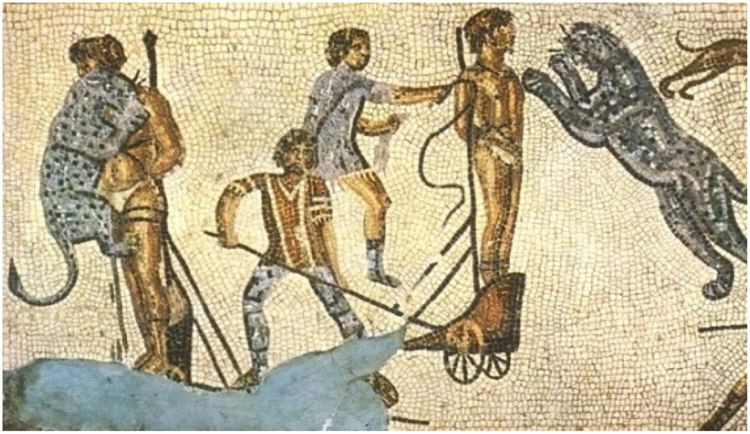 闘技場での役割についても従来の解釈が見直された。ロリケはこの人物を「アギタトル(agitator)」としたが、この用語が闘技場の役職として実在した証拠は確認されていない。マナスは、片手に鞭、もう一方に武器とみられるものを持っている点に着目する。死刑囚は武器を与えられずに獣と対峙させられるため、この人物は訓練を受けた狩人だった可能性が高く、獣を追い立てる補助役だったと結論づけている。