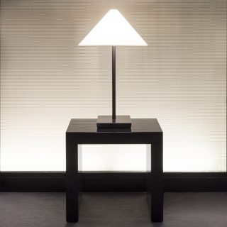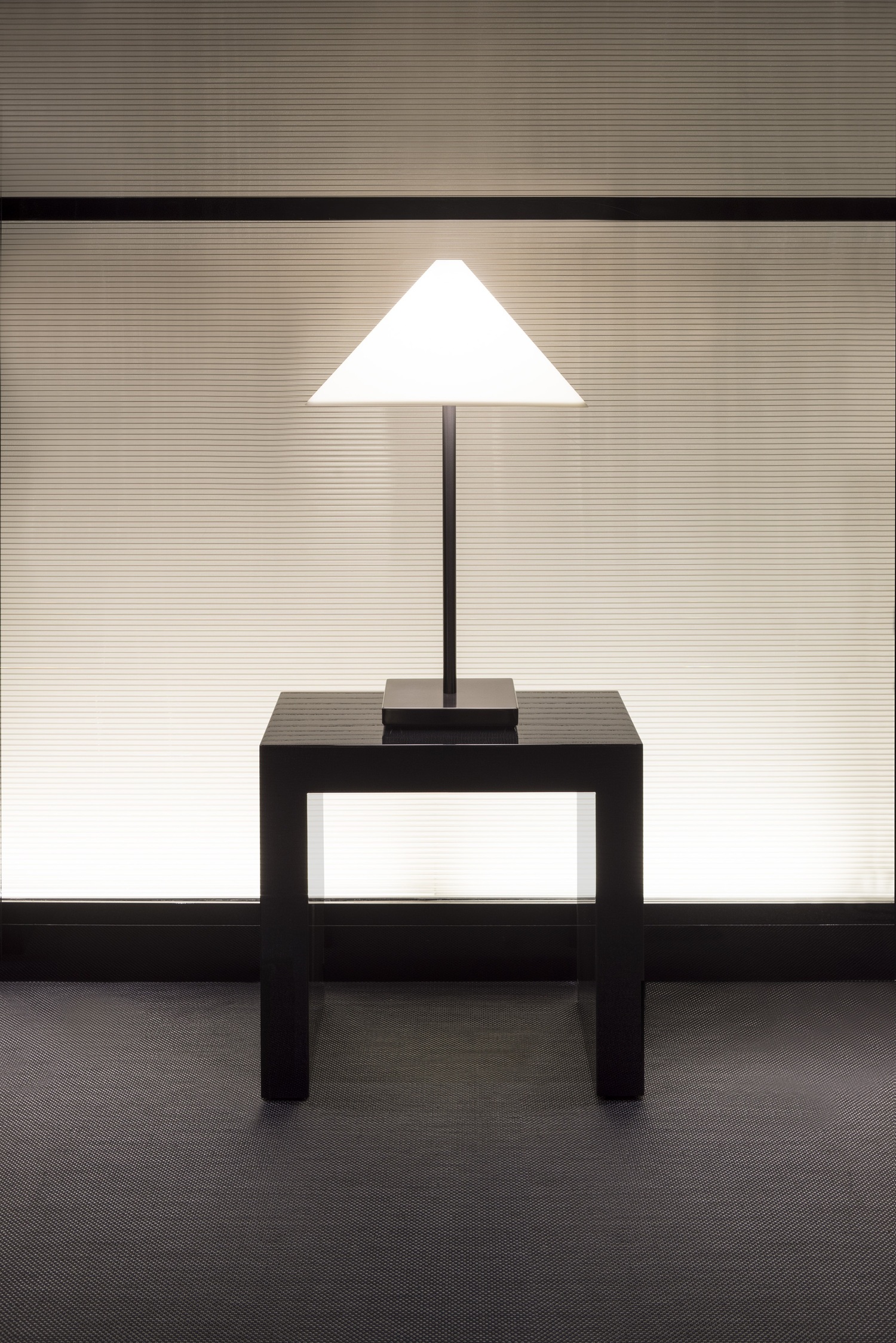 展示の中心に据えられるのは、1982年にアルマーニ自身がデザインしたテーブルランプ「Logo Lamp」。このプロダクトは、手元を照らすという機能性を担いながらも、視界を遮らないフォルムを備え、光を「落とす」ための装置として設計されている。単なる照明器具を超え、ブランドの原点的思想を体現する象徴として位置付けられる。