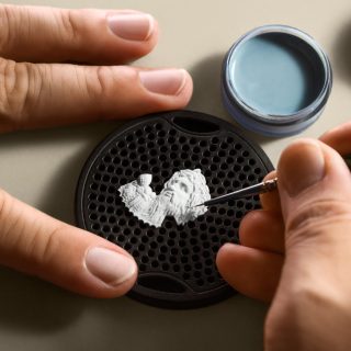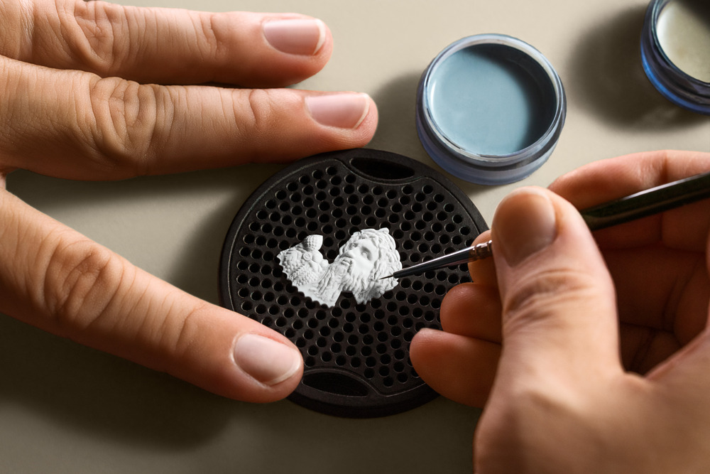 特筆すべき挑戦は、石材を用いたグリプティック(浮彫彫刻)の導入だ。前作がゴールド彫刻であったのに対し、今回は徹底した調査のもと、オリジナルと同じ産地の大理石や石灰質砂岩を採用。双眼顕微鏡を用いた手作業によって施される微細彫刻は、素材ごとの特性を熟知した限られた職人にしか実現し得ない高度な技だ。