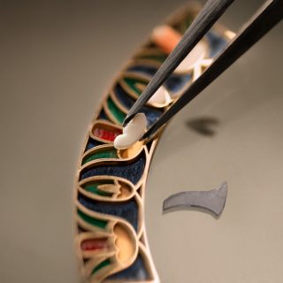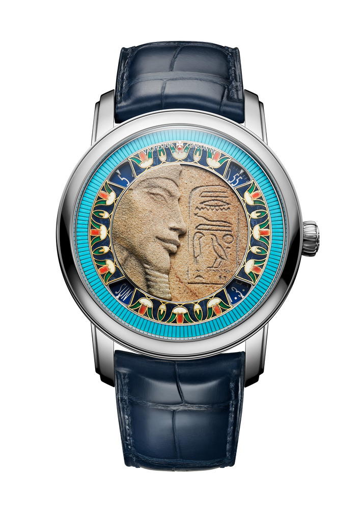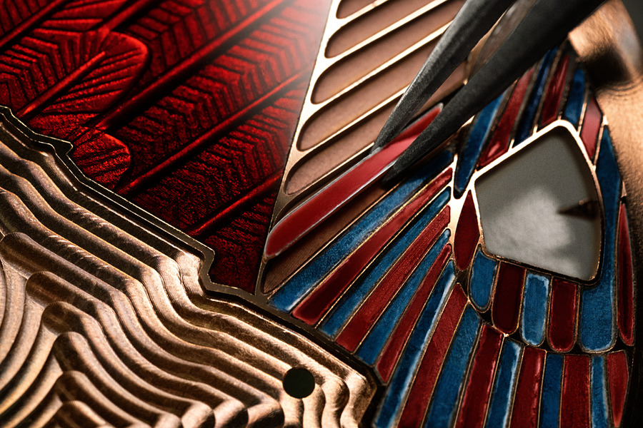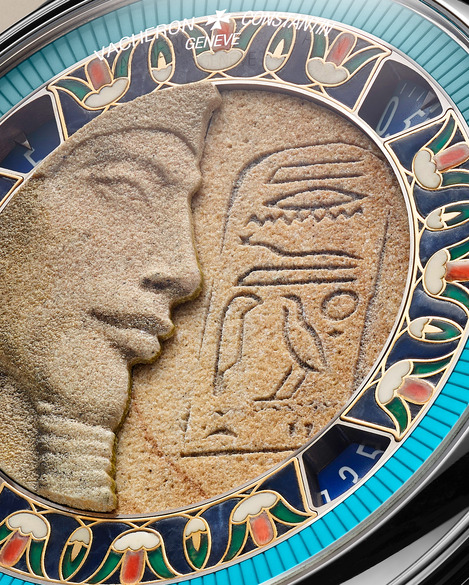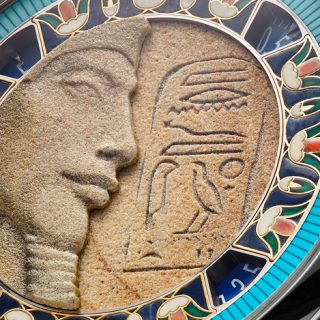 ツタンカーメンの父として知られるアクエンアテンは、太陽神アテンを唯一神とする宗教改革を推し進めた異端のファラオだ。本作では、19世紀にアマルナで発見された胸像をもとに、同じシナイ産の石灰質砂岩を用いて再現。やや見上げる角度から捉えた構図により、その神秘的かつ孤高の存在感が際立つ。外側のフリーズには第12王朝の神官の襟飾りから着想を得たターコイズのエングレービングを、内側にはレッドマザーオブパールやクリソプレーズなどを用いたシャンルヴェ装飾を施し、約150時間を費やして完成された。
