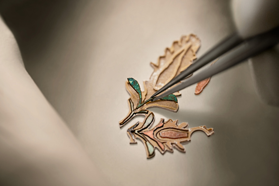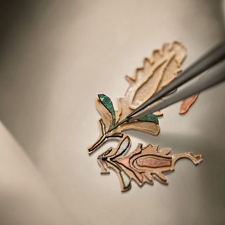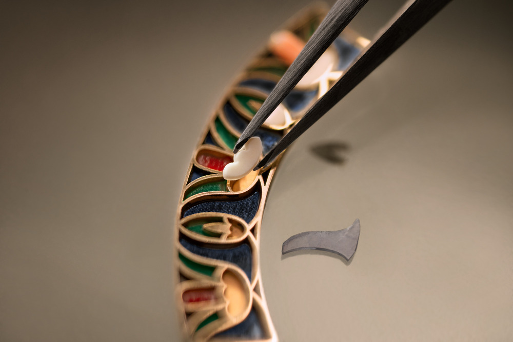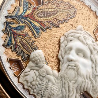 さらに本シリーズでは、第1弾同様に自社製ムーブメント「キャリバー2460 G4/2」を採用。針を排した構造により、ダイヤル全面を芸術表現のためのキャンバスとして解放している。時刻表示は4つの小窓で行われ、視認性を確保しながらも装飾と見事に調和している。厚さわずか6.05ミリの自動巻きムーブメントは約40時間のパワーリザーブを備え、機能美と造形美を高次元で両立させた。