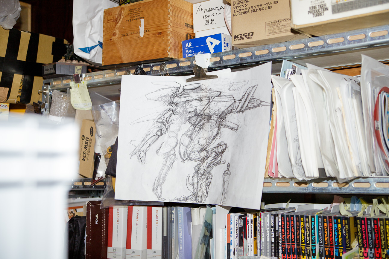 大まかにシルエットや手足のバランスを決めたらつくり始めることが多いですね。パーツとなるプラスチックモデルや容器などは普段から集めています。また、日常的にラフスケッチを貯めこんでおいて、そこから選ぶこともあります。ミキシングビルドでは精緻なスケッチはあまり描きません。ラフのラフ、フォルム程度です。詳細に描いてしまったらプラ材や樹脂粘土でフルスクラッチする方が良いですから。そういった方法で造形物をつくることも多々ありますが、ミキシングビルドの醍醐味は既存パーツを組み合わせて新しいモデルをつくることだと思っています。