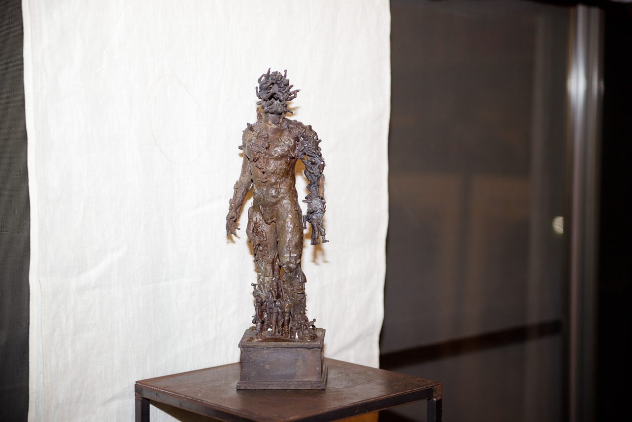私の彫刻は「スケール」「断片」が常にキーワードとなっています。例えばこのブロンズ像は、プラモデルのパーツをコラージュした原型を消失鋳造して、形を精密に一塊の別の存在へと置き換えました。異なるスケールのプロダクトの断片が混在する像を介して、作品そのもののスケール、鑑賞者の身体スケール、展示空間とその外側にある世界のスケールがどのように関係し、変性してきたのかを探っています。
