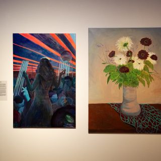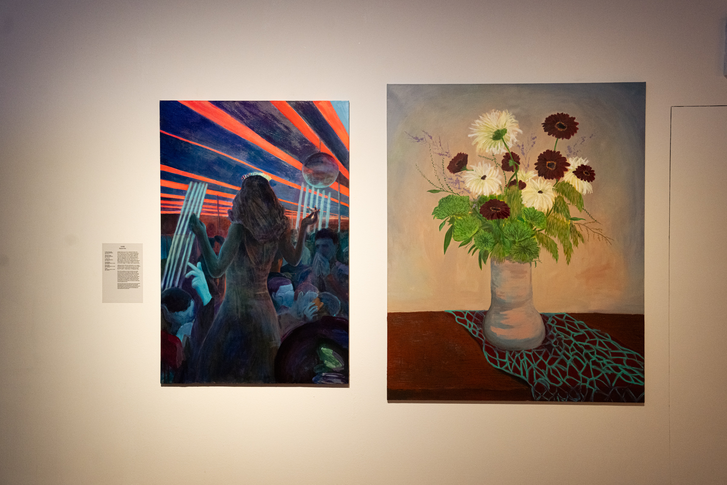 たとえばチョン・ナファン《Anessa's Room》《For a Flash》は、ドラァグクイーンのAnessaがパフォーマンスに向けて変容していく様子を記録した映像作品であり、展示室の床には銀色の紙吹雪が一面に敷き詰められている。紙吹雪は鑑賞者の靴底に付着し、館内のあちこちへ運ばれていく。クラブという場の物質性は鑑賞者の身体を媒介しながら、作品を超えて広がっていってしまう。あるいは、キム・リョムの絵画作品はまた別の形でクィア文化のつながりを感じさせた。《Serving Butterfly》はかつて梨泰院に存在した「Trunk」というクラブのワンシーンを描いたものであり、展覧会のオープニングに際した行われたアフターパーティの会場はまさにTrunkがあった雑居ビルのワンフロアに位置するクラブだった。こうした接続が意図的に行われているかはさておき、クィアな空間はいまもなお都市のあちこちに広がろうとしているのである。