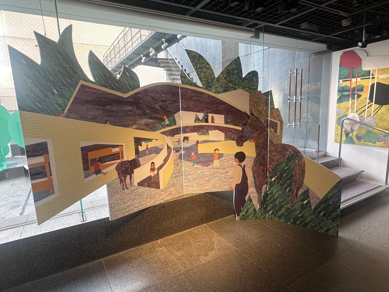 そんな同氏の初の個展となるこの展覧会は、まさにポリフォニックな空間を立ち上げるものだった。会場には《daita2019》の1/5模型と等身大を超える断面ドローイング、《miyazaki》《hebi》《pony》などの模型・ドローイングが互いに近接して並んでおり、中庭には大阪・関西万博につくられた《expo'25 rest area 3》の大型模型が置かれ、別の展示室では3つの壁を使った映像インスタレーションが展開されている。
