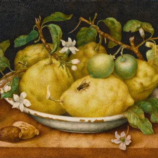 ジョヴァンナ・ガルゾーニ(1600-1670)は細密画家として知られるが多彩な才能に恵まれていた。2020年、フィレンツェのピッティ宮殿で開催された展覧会ではテキスタイルやカリグラフィーを含む幅広い作品が展示された。ジョヴァンナ・ガルゾーニ《柑橘類のボウルのある静物》(1640年代後半) Photo: J. Paul Getty Museum