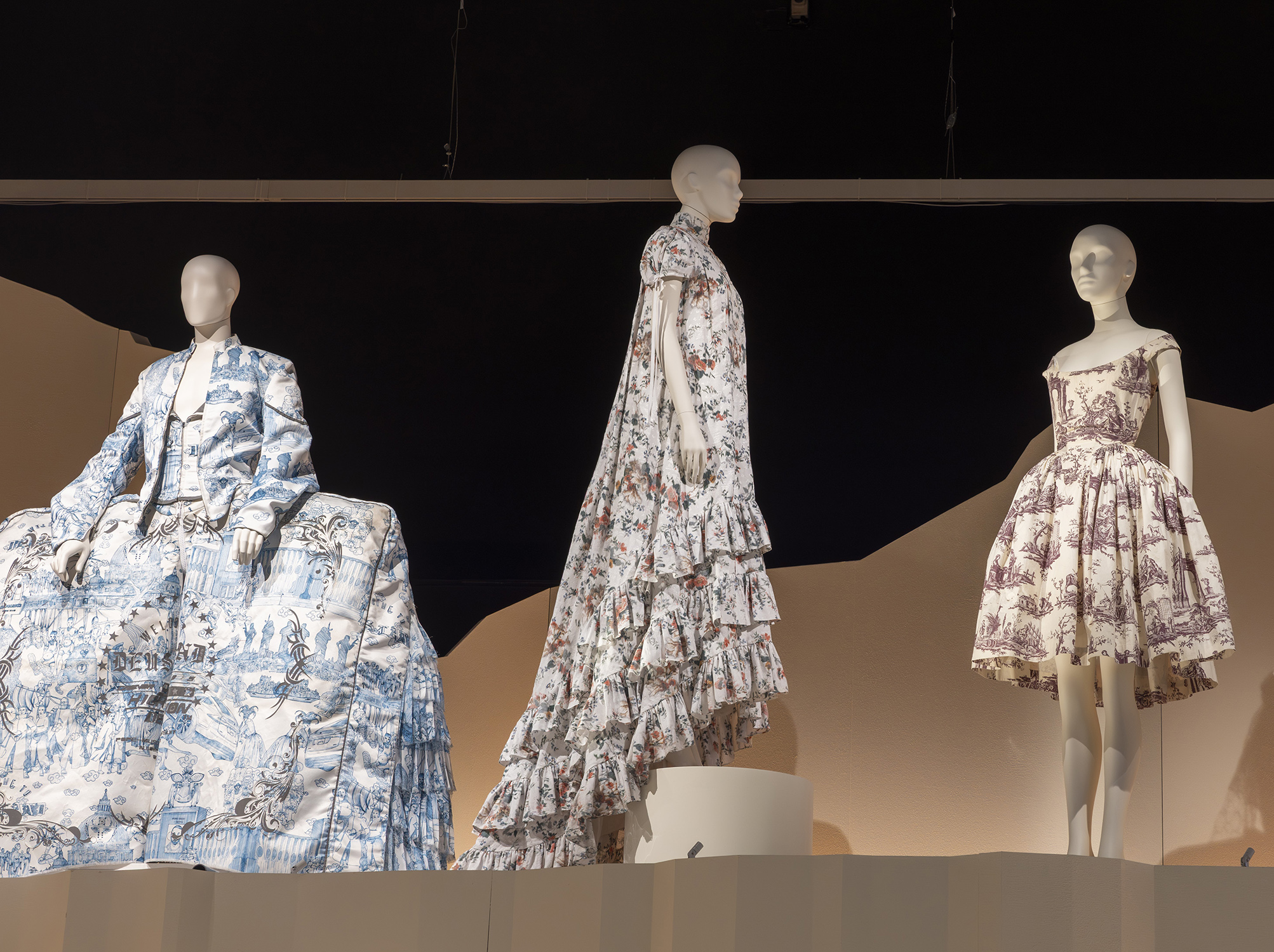 写真の左右は、トワル・ド・ジュイのプリント地による、アンドレア・グロッシのアンサンブル(2019年ポリモーダ卒業制作)とヴィヴィアン・ウエストウッドのパニエドレス(1996年春夏コレクション)。中央、フリルのトレーンとティアードスカートが印象的なイヴニングドレスは、アーデムのコレクション(2022年春夏)。横浜展ではデザインのディテールに迫る展示を予定している。