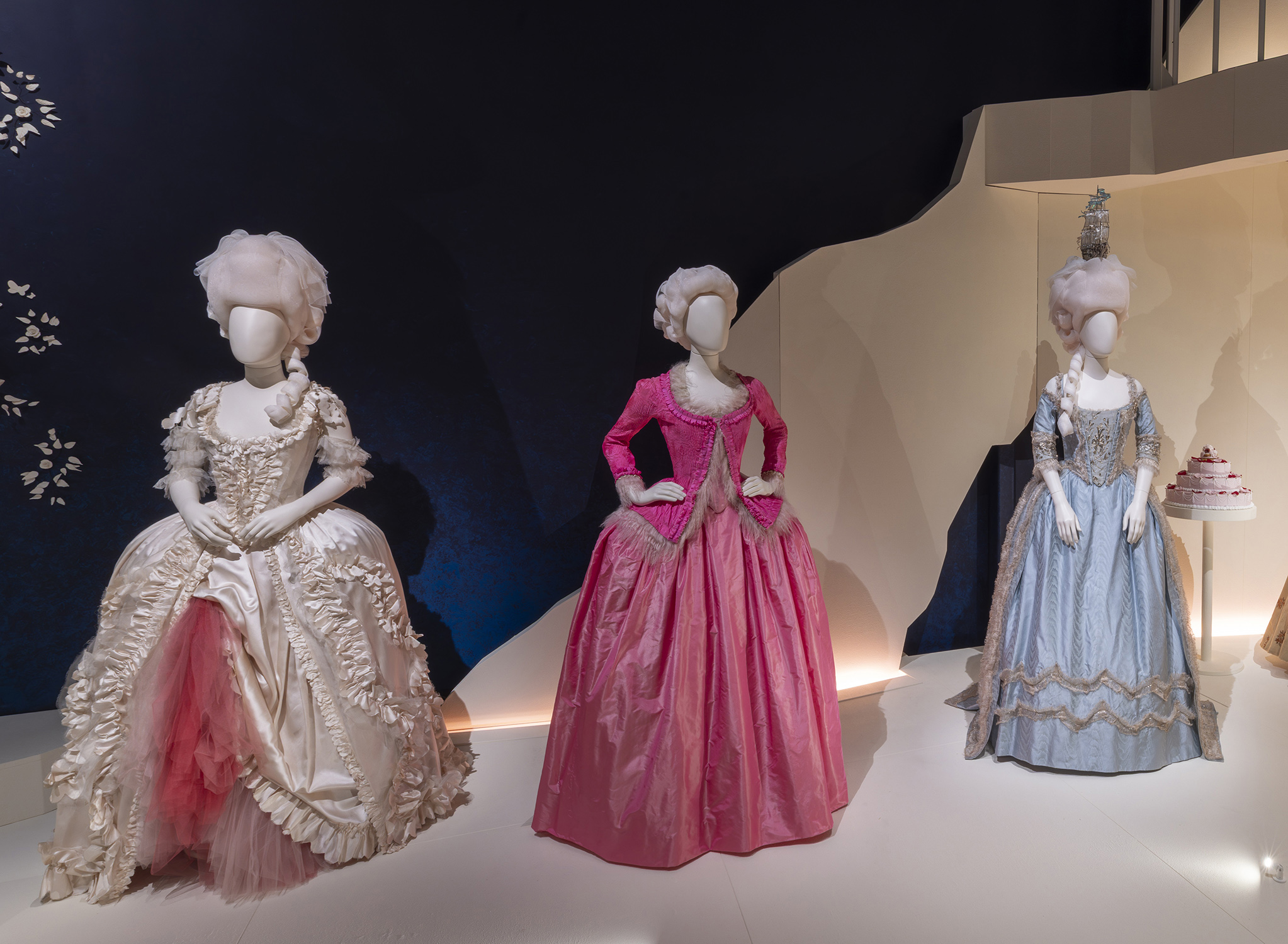 ソフィア・コッポラ脚本・監督、キルスティン・ダンスト主演の映画『マリー・アントワネット』(2007)は、ピンヒールのパンプスやポップミュージック、色とりどりのマカロンなど、18世紀の宮廷に「現代」を織り込んだ構成が話題になった。第79回アカデミー賞で衣裳デザイン賞を獲得したコスチュームも展示される。