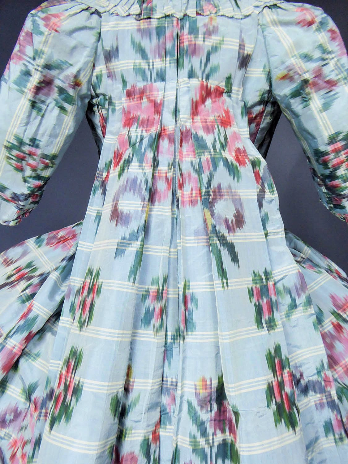 ローブ・ア・ラ・フランセーズは、18世紀のもっともフォーマルなドレスの形式。白いストライプの走る絹地に、つるバラと花束の連続模様が施されたこのドレスは、マリー・アントワネットの好みだったシネ・シルクという手法の布で作られている。シネ・シルクは、あらかじめ模様を計算して糸を先染めして織り出されるという、非常に高度な技術の上で生み出されている。