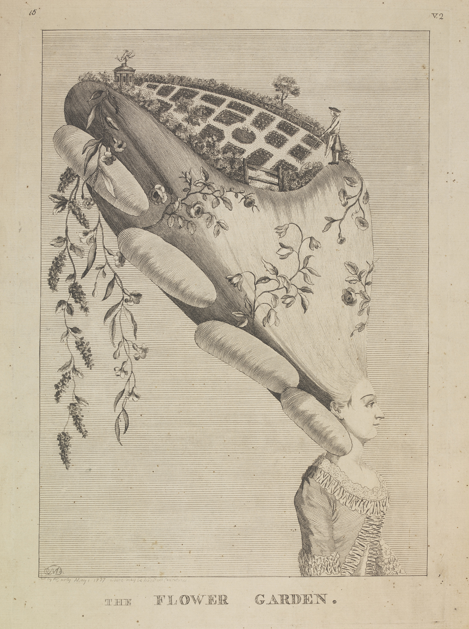 結髪師レオナール・オーティエとモード商のローズ・ベルタンが生み出した、高く盛られた髪型や華美な頭飾りは、この時代の宮廷に特徴的な装いだ。奇抜な髪型が流行すると、風刺画家たちはその姿を誇張して描き出した。この作品のテーマは「花園」。熊手を持った庭師のいる庭園や、垂れ下がる花々で飾りたてられた「髪」は、女性の顔の数倍にも拡張されている。