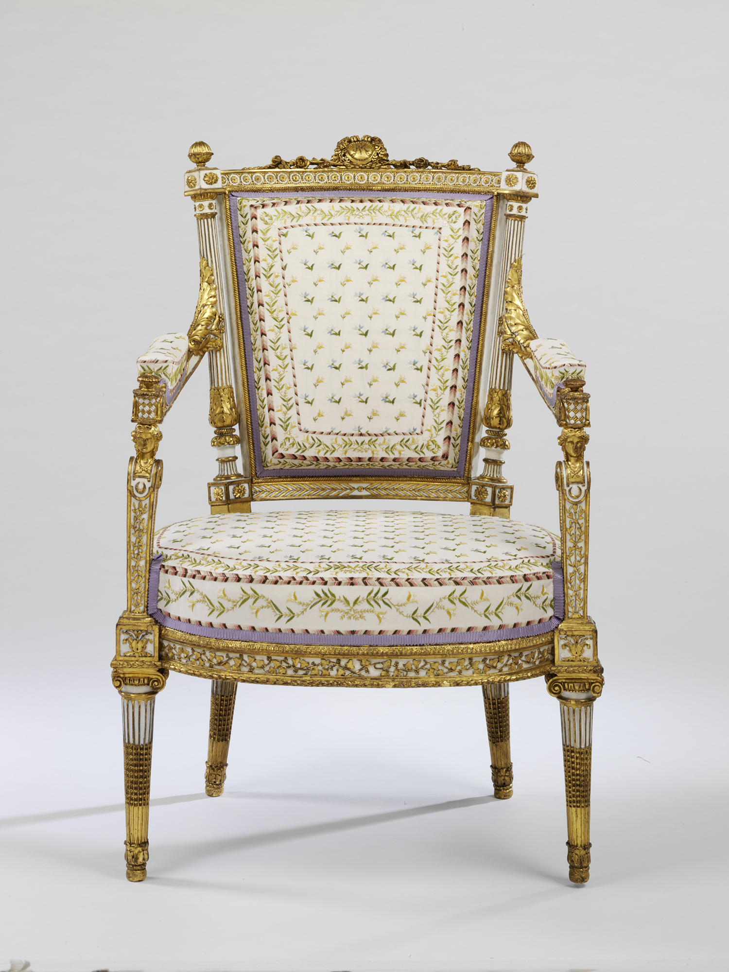 マリー・アントワネットの肘かけ椅子(4点組の1点) ジャン゠バティスト゠クロード・スネ(作) 1788年 木(クルミ)に着彩、絹で刺繍した綿(近年の上張り) H. 97.5 × 63.5 × 63.0 cm ヴィクトリア&アルバート博物館蔵 © Victoria and Albert Museum, London
