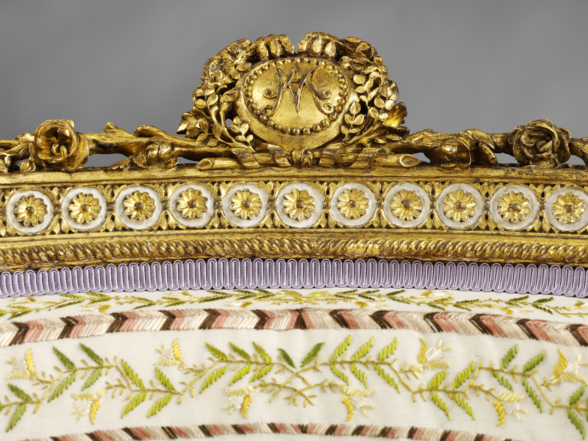 修後、王家はそこで夏を過ごした。 この椅子は、もっとも私的な空間であった化粧室で王妃が使用したものだ。小花柄や、白や紫の軽やかな色合い、背もたれの上にあるバラとギンバイカで円形に縁取られたモノグラム「MA」など、そこには当時の彼女が好んだスタイルの特徴が盛り込まれている。